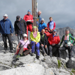 Nach einem guten Frühstück und mit trockener Kleidung machen wir uns auf den Weg zur Douglas Hütte. Nun war es an mir, die Gruppe als Co übers Saulajoch hoch zum 2517m hohen Saulakopf zu führen. Etwa 200 m unter dem Gipfel richten wir ein Rucksackdepot ein, um die schöne, leichte Kletterei hoch zum Gipfel besser genießen zu können. Natürlich haben wir unsere Gruppe noch im Gipfelbuch verewigt, die obligatorischen Gipfelfotos gemacht um uns dann wieder zum Abstieg hin zu unseren Rucksäcken zu machen.
