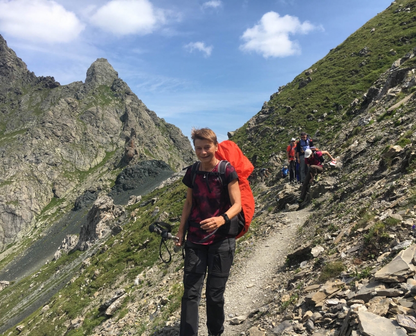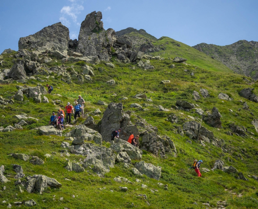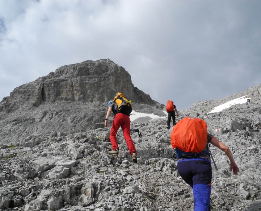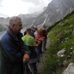 Heute wollen wir zu den 3 Türmen, die auf 2830 m liegen. Da Gewitter angesagt sind, starten wir recht früh. 1085 hm liegen vor uns. Der Weg dorthin verläuft bis zu einem Geröllfeld auf einem schönen Bergweg. Aber von nun an wird die Wegfindung zum Gipfel etwas schwierig, da die Wegmarkierung schon ziemlich verblasst ist. Harald führt uns souverän durchs Geröll. Die Regenschauer kündigen sich viel früher an, als vorhergesagt. Das bringt unsere Truppe aber nicht weiter aus der Fassung. Munter steigen wir weiter Richtung Gipfel. Wir stehen jetzt ca. 100 m unterhalb eines Schneefeldes, mit abnehmender Sicht, Wind, starkem Regen wird es ziemlich ungemütlich. Oberhalb sehen wir 3 Bergwanderer die den Einstieg zum Gipfel suchen. Wir hören die aufkommenden Gewitter und entschließen uns nach kurzer Beratung die Tour aus Sicherheitsgründen abzubrechen und zurück zur Lindauer Hütte abzusteigen. Schade.
