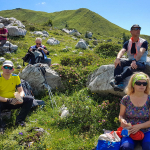 Frisch und gestärkt gibt es am Abend eine kleine Führung durch einen eigens von der Sektion angelegten Botanischen Garten. Wir treffen hier auf einen sehr engagierten Bergsteiger und Botaniker der die Führung leitet. Die Führung startet mit einem kleinen Ehrenbekenntnis in Richtung Pfälzer Kletterer und kleinen wohl gemeinten Seitenhieben auf unsere Pfälzer Weinkultur, wo man laut Aussagen unseres Führers, den Wein wohl aus Blumenvasen trinken würde, was er so noch nirgends gesehen hätte. Wir erfahren vieles über die hiesigen Pflanzen im Alpenraum, und werden wohl in Zukunft noch bedachter mit unserer Natur umgehen. Dort in diesem Tal wo sich zwei tektonische Platten vor 25 Millionen Jahren trafen, schaut man südlich auf schroffe afrikanische Kalksteinmassive und nördlich auf die 2 Millionen Jahre älteren, grün bewachsenen europäischen Granithänge.