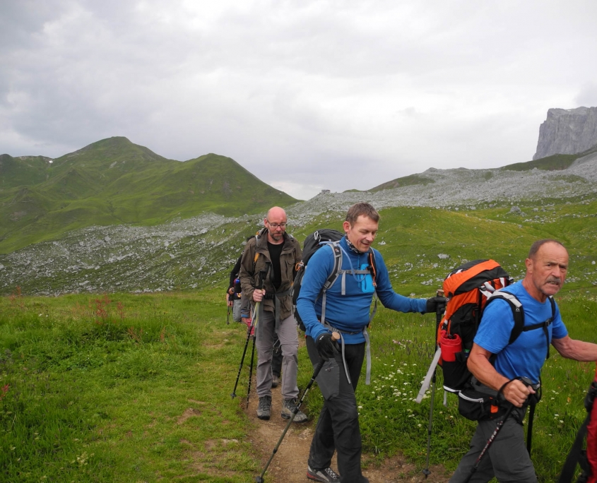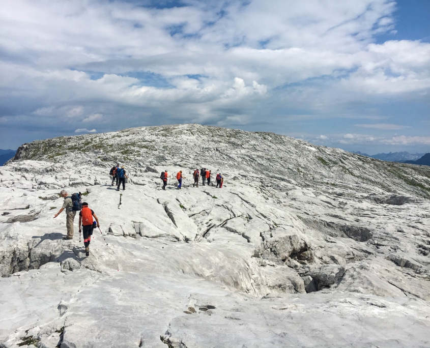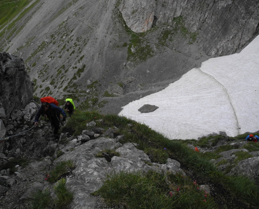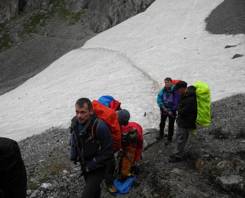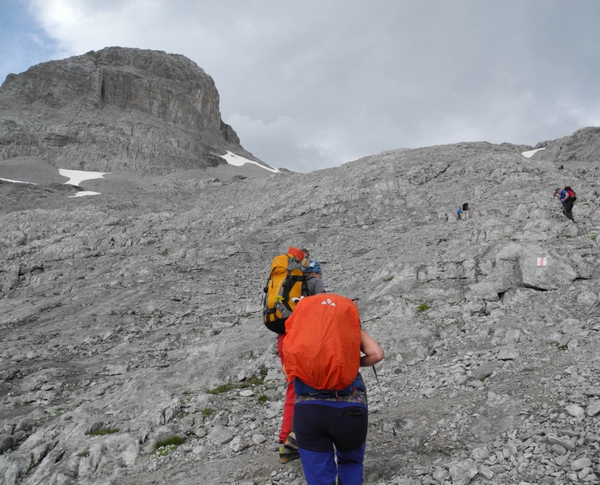 Heute steht die 2817 m hohe Sulzfluh auf dem Plan. Ich walte meines Amtes und führe unsere Gruppe bis hin zu einem kleinen Schneefeld. Hier prüft Harald die Beschaffenheit des Schnees und führt die Gruppe rüber zum Einstieg, eines mit Stahlseil versicherten Steiges. Weiter hinauf geht es dann im Gänsemarsch ca. 500 hm über Geröll und Bruchgelände steil bergauf, bis zum Bergfuß. Das Wetter weiß heute auch nicht so recht was es will, Regen, Hagel, Sonnenschein und Wind, nur Schneefall hat noch gefehlt, dann hätten wir alle Wetterlagen durchgehabt. Nach dem wir kurz unter des Gipfel unsere Rücksäcke vor den immer wiederkehrenden Wetterwechseln wetterfest verstaut hatten geht es, nun eigentlich nicht mehr so steil, hoch zum Gipfel. Die Sonne schaut dann auch noch kurz bei uns vorbei, die Gelegenheit für ein paar Fotos am Gipfelkreuz. Das Wetter zwingt uns dann aber recht schnell über ein Felsplateau, das von einem Gletscher glattgeschliffen ist, weiter runter zur Tilisunahütte abzusteigen, wo wir uns von den Wetterphänomenen erholen und die gute Küche genießen. Frisch gestärkt geht`s weiter Richtung Lindauer Hütte, unser letztes Domizil der Tour. Wir müssen noch einige Höhenmeter hoch zum Bilkengrat. Der Weg dahin, durch die Schwarze Scharte entpuppt sich dabei als landschaftlich und wandertechnisch schönes Stück Weg.