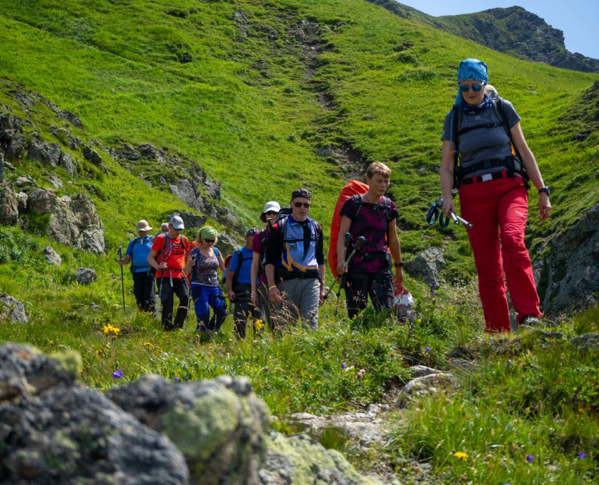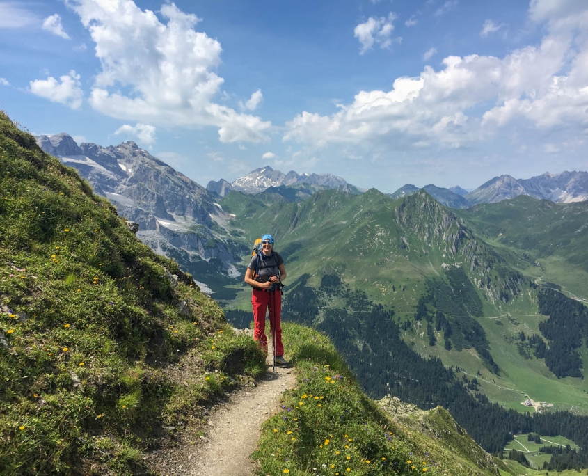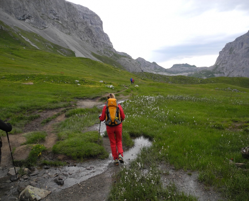 Die grandiose Landschaft, voller saftiger, bunter Blumenwiesen im Kontrast zu mächtigen grau leuchtenden Felsmassiven laden uns zu einer kleinen Rast ein, bevor wir die letzte Wegstrecke zur Carschinahütte in Angriff nehmen.
