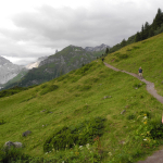 Entlang des Lüner Sees, der uns noch eine Weile begleitet und auch später nochmal auftaucht, geht es hoch durch eine Heidi-Landschaft, mit vielen grasenden Kühen, durch tolle abwechslungsreiche und saftige grüne Berghänge hin zum Verajoch.