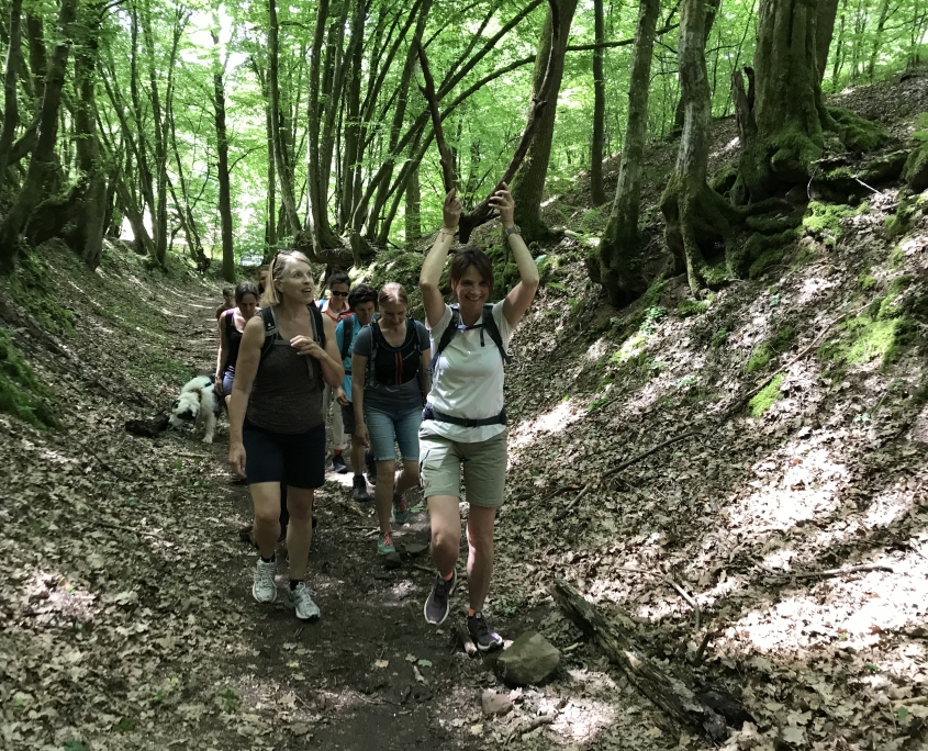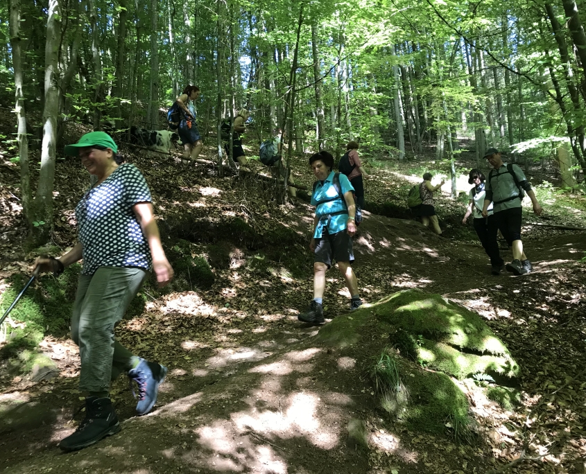 Ganz konform mit den Regularien des DAV kommen wir CO2-neutral in Rodalben an und starten unsere Tour zum Hilschberghaus. Dort kommen noch Jutta und Jürgen zu unserer Truppe dazu. Durch ein schmales Tor geht es auf den Felsenweg, der hier ein Teil des Pfälzer Waldpfades ist. Auf schmalen Pfaden entlang von Buntsandsteinfelsen mit ihrer besonderen wabenförmigen Verwitterungsstrukturen laufen wir zum Saufelsen. Danach ist der Premium-Wanderweg auch als Mountainbike Strecke ausgewiesen – Begegnung von Mountainbikern mit unserer „großen Gruppe“ sind stets respektvoll. Über den Waldpfad wandern wir weiter zu einer ausgiebigen Rast an der PWV-Hütte Gräfenstein.