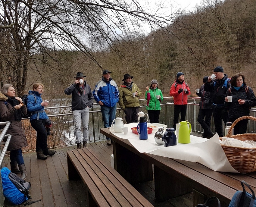 Der ursprünglich geplante direkte Abstieg nach Ramsen war wegen des aufgeweichten Bodens nicht möglich. Daher ging es ein Stück über asphaltierten Feldweg nach Ramsen und dann in den Stumpfwald hinein bis zum Eiswoog. Die Hälfte der Strecke war geschafft und passend zur Mittagszeit erreichten wir den kleinen Stausee. Dort wurden wir mit heißem Glühwein, Punsch und selbstgemachten Muffins überrascht. Nach der genussvollen Stärkung ging es leicht ansteigend durch das Dreibrunnertal bis zum Stumpfwaldgericht, einer alten Gerichtstätte der Grafen von Leiningen. Bereits zur Keltenzeit sollen auf der Waldlichtung Urteile gefällt worden sein.