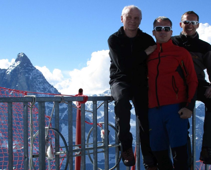 Tag 1: Als Fahrgemeinschaft fahren Rüdiger Bauer, Michael Piotrowski und Gabor Koppanyi ins Mattertal nach Grächen. Weiter geht es mit dem Zug nach Zermatt. Hier bedienen wir uns einer Anstiegshilfe und benutzen die Seilbahn hoch zum Klein Matterhorn. In der Talstation geben wir vorher Bescheid, dass wir die Übernachtungsgäste im Lodge-Matterhorn sind. Oben angekommen werden wir auch schon sehnsüchtig empfangen und eingewiesen. Danach verlässt das Personal den Berg mit der letzten Gondel. Gegen 16:00 Uhr sind wir mit anderen Gästen allein in der Lodge. Das vorgekochte Essen macht man sich in der Mikrowelle warm und zum Trinken holt man sich O-Saft, Tee, Kaffee oder Schoko. Ein großer Aufenthaltsraum, moderne Sanitärräume und WLAN sind im Preis inbegriffen. Doch vor dem Abendessen vertraten wir uns noch die Beine und besuchten die Aussichtsplattform des Klein-Matterhorns und genossen das Panorama „Eiswüste“ und „Matterhorn“.