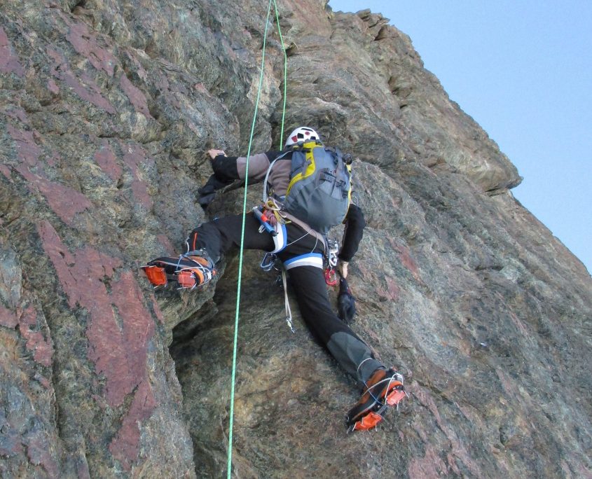 Tag 2: Nach einem ausgiebigen Frühstück starten wir früh morgens zur Breithornüberschreitung von Ost nach West. Also mussten wir erst die Gletscher Kleinmatterhorn, Breithornplateau und Grande Ghiacciaio di Verra queren. Nähe Schwarztor steigen wir in den Felsen ein. In leichter Kletterei bis Stufe 3 überschreiten wir unsere ersten 5 Gipfel auf dieser Tour, mit darunter Roccia Nera (4.075m), Breithornzwillinge (östlicher Zwilling / Gendarm 4106 m & westlicher Zwilling 4139 m), Mittelgipfel (4159 m) und Breithorn Hauptgipfel (4.164 m). Natürlich ist viel Gratwandern im Firn und Fels mit dabei. Nach dem vielen Auf und Ab, auch mit einigen schönen Abseilpassagen, kehren wir bei schönstem Sonnenschein über den Kleinmatterhorn-Gletscher wieder in der Lodge ein.