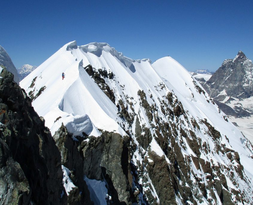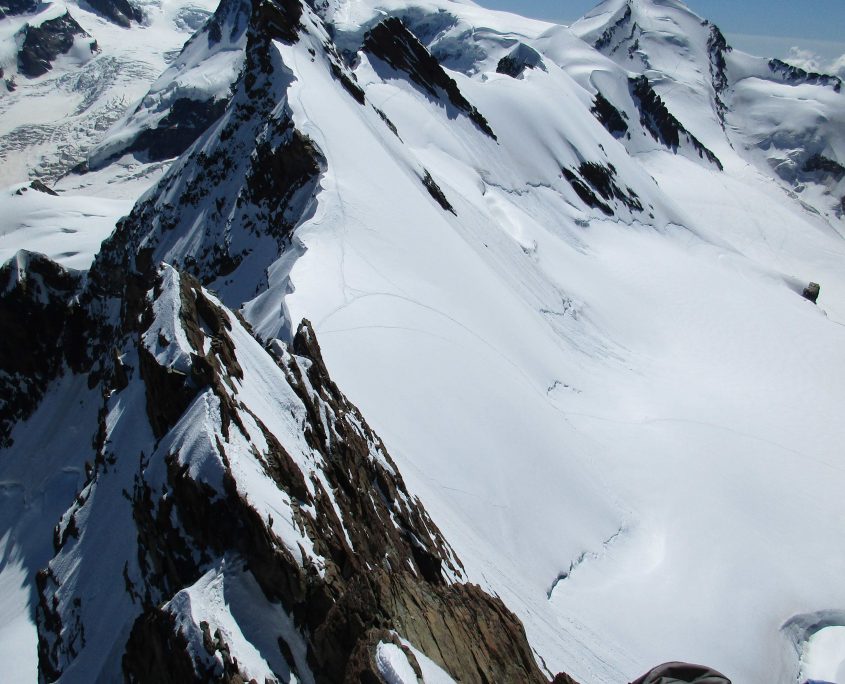Der Abstieg nach Westen verlief über einen Grat. Den Blick nach vorne gerichtet sah man den Lyskamm, mit seinem nicht enden wollenden Bergkamm. Der Lyskamm war kaum frequentiert, eine Gruppe war vor uns bereits am Gipfel. Wir folgten. Der Lyskamm hat zwei Gipfel, den Ost- (4.527 m) und Westgipfel (4.480 m), die über einen Kilometer auseinanderliegen. Von dort oben konnten wir unser Tagesziel, die Monte Rosa-Hütte sehr gut erkennen – tief unten auf der anderen Seite des Grenzgletschers. Auch das Matterhorn war nun viel weiter weggeruckt und verlor schon an seiner Dominanz.