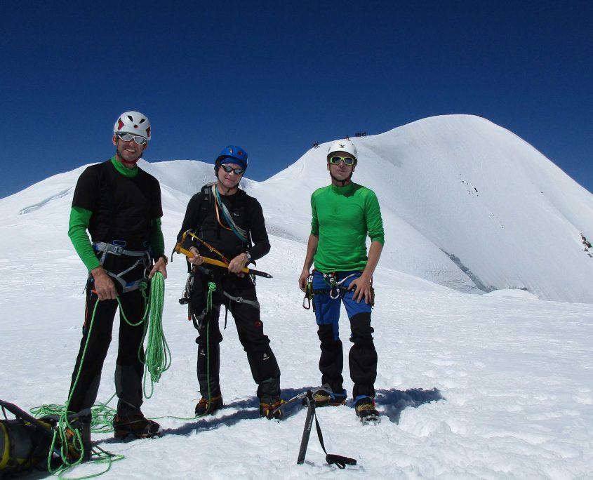 Der Abstieg war steil und durch die Sonne bereits aufgeweicht. Nun waren wir auf dem fast ebenen Firnfeld, am Lisjoch, angekommen. Hier stärkten wir uns und unterhielten uns kurz mit der Schottisch-Brittsich-Irischen Gruppe die Richtung Gnifetti-Hütte abstieg. Wir mussten in die andere Richtung, erst ein Stück hoch Richtung Nordosten um auf den Grenzgletscher zu kommen. Schade, so greifbar nah die weiteren Viertausender, die wir auslassen.