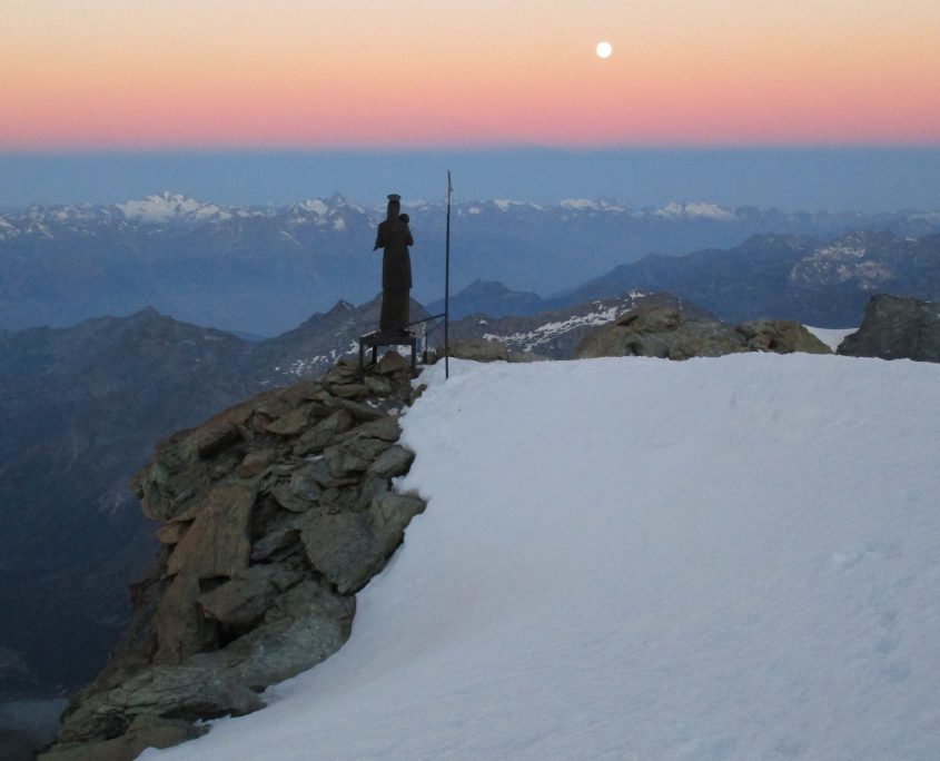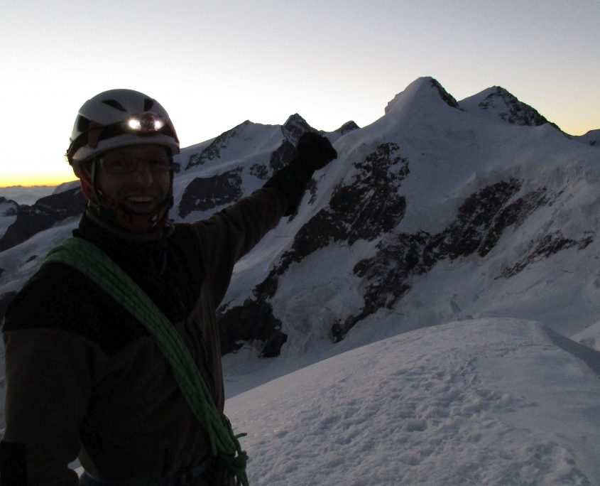 Tag 3: Der Wecker geht um 2:00 Uhr (wessen Idee war das nochmals?), Frühstück und sich fertigmachen. Um 3:00 Uhr stehen wir startklar vor dem Rolltor des Kleinmatterhorntunnels. Im Prinzip leuchten uns die Stirnlampen den gleichen Weg wie am Vortag zur Breithornüberschreitung. Gegen 5:40 Uhr stehen wir auf dem Pollux (4091 m) und genießen den Sonnenaufgang. Der Aufstiegsweg verläuft über ein steiles Firnfeld. Der Abstieg führt an der Madonnastatue vorbei, in deren Nähe sich die Ketten zum Abseilen befinden und an denen wir uns runter hangelten. Etwa 150 Hm unter dem Gipfel hatten wir ein Rucksackdepot eingerichtet um etwas Kraft für den restlichen Tag zu sparen. Nach einer kurzen Pause machten wir uns zum weiteren Abstieg Richtung Castor. Jetzt begegneten uns die ersten Mitbergsteiger. Richtung Gipfel zum Castor (4226 m) waren bereits zwei Gruppen vor uns. 50 Hm unterhalb des Gipfels gab es heute Morgen eine Schlüsselstelle. Durch die starke Sonnenstrahlung am Vortag und anschließende runter Kühlen in der Nacht war eine mächtige Eisplatte entstanden. Eine Gruppe drehte unter diesen Umständen um. Bestimmt versuchen sie es am Nachmittag, wenn es getaut hat und die Platte griffig ist es erneut. Die zweite Gruppe mit ca. 6 Leuten am Seil und einem Bergführer war vor uns, bzw. nachdem Michael die Eisplatte parallel geklettert war, hinter uns. Ich sicherte Michael unten mit einer Eisschraube und er wiederrum mich oben mit einer Eisschraube. Gut gesichert war es kein Problem sich im Eis hoch zu hacken. Der Bergführer hatte mit seinen Anvertrauten sichtlich viel zu tun, entsprechend war auch seine Laune.