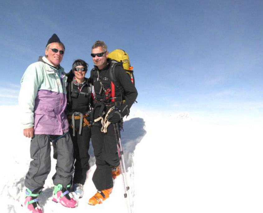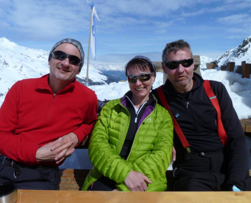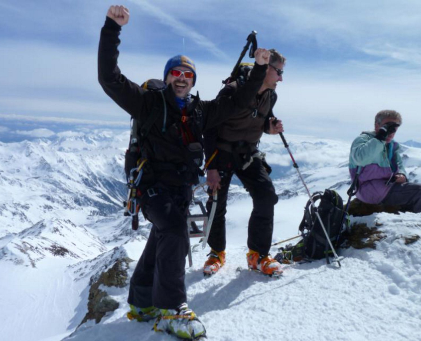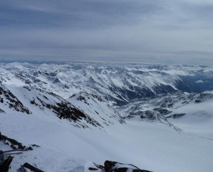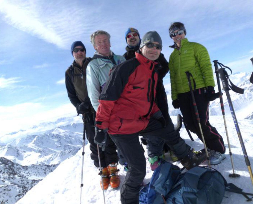 Am nächsten Morgen starten wir 7 45 Uhr Richtung Zufallspitze (3.757m). Erst zieht sich der Aufstieg über ein langes Gletscherbecken mit kaum Steigung. Weiter geht’s, nach einer Rast, über eine Steilstufe hinauf zum Skidepot auf 3500m. Hier satteln wir um auf Steigeisen, die aber nicht dringend erforderlich sind, und steigen den Grat hinauf zum Gipfel. Dort werden wir mit einer grandiosen Fernsicht auf Chevedale, Königsspitze, Ortler und weiter über die Brenta, fast bis zum Gardasee, belohnt. Zurück am Skidepot, Felle abziehen und los gehts zur ersten Abfahrt. Günther, Klaus und ich müssen uns erst mit dem Tiefschnee anfreunden! Albrecht und Alex wedeln schon! Auch bei uns wird’s besser und wir erreichen nach einem tollen Skitag gegen 15.30 Uhr gut gelaunt die Hütte. Der erste Gipfel wird mit Russen und Apfelschorle begossen. Weitere Belohnung ist die Dusche und das leckere Abendessen.