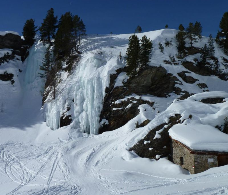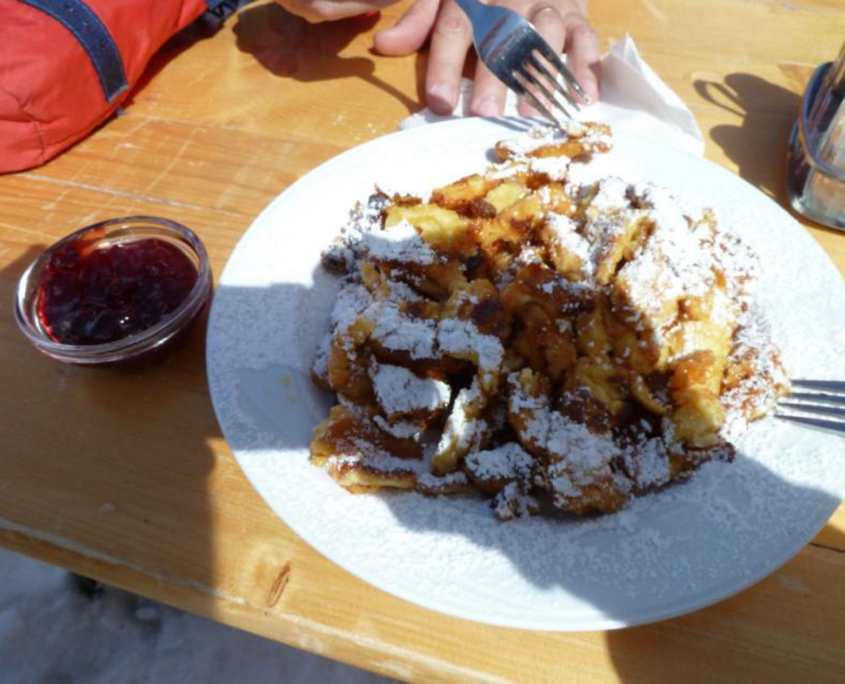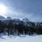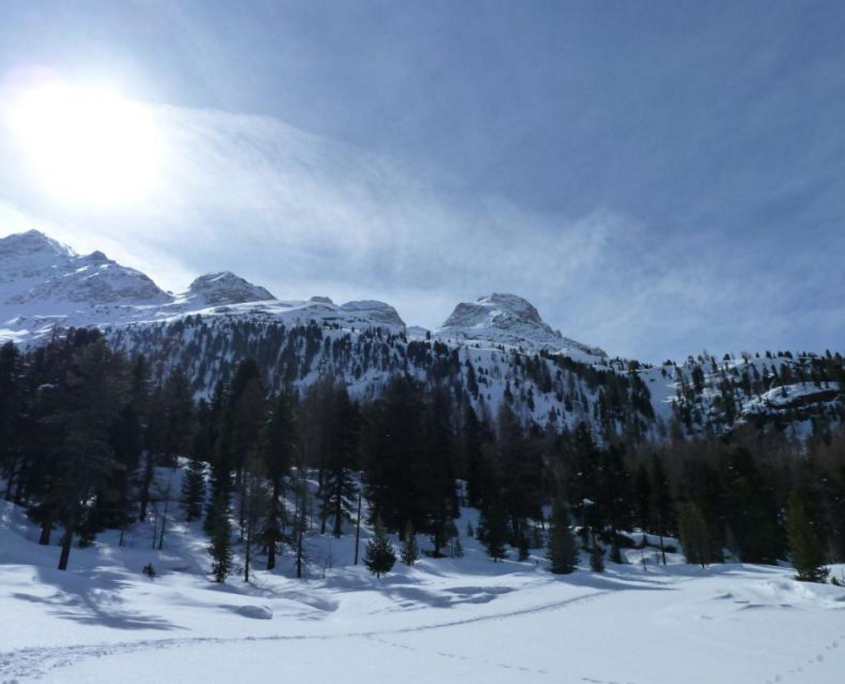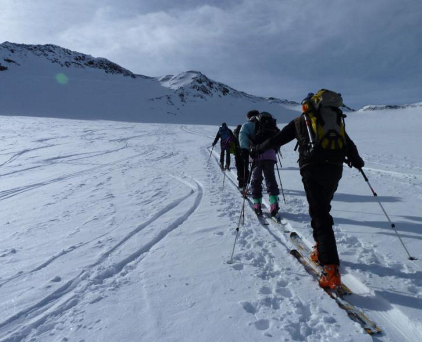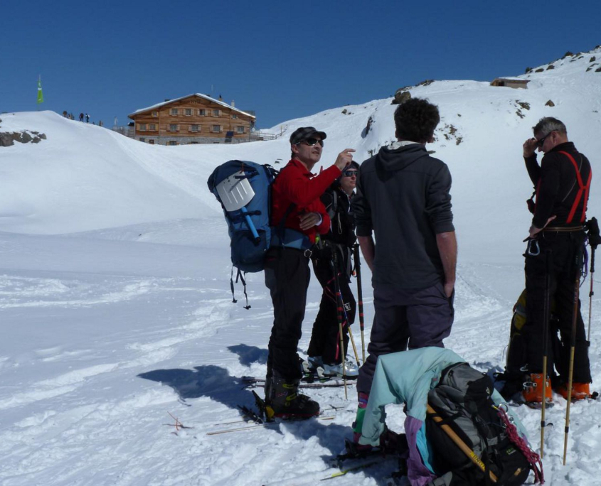 Nach guter langer Fahrt treffen die vier Pfälzer ( Alex (FÜL Skibergsteigen), Albrecht, Klaus und ich (Corinna)) am Ende des Marteller Tals auf den Franken (Günther). Die Rucksäcke werden geschultert und los geht’s Richtung Marteller Hütte auf 2.610m. Der Weg zieht sich gemütlich nach oben, vorbei an der Zufallhütte gleiten die Skier über den Glitzerschnee. Ein traumhafter Skitag! Nach 2 Stunden erreichen wir auch schon die Hütte und beziehen unser gemütliches Zimmer. Dann beginnt die Planung zwecks Wettterlage. Leider soll es nicht so schön bleiben. Gemeinsam beschließen wir auf der Marteller Hütte zu bleiben und Tagestouren zu unternehmen. Spätestens nach dem Abendessen, das von einem sehr netten Hüttenteam serviert wird, wissen wir: Das war eine gute Entscheidung!!! Ein leckers 4Gang-Menue wird uns kredenzt….