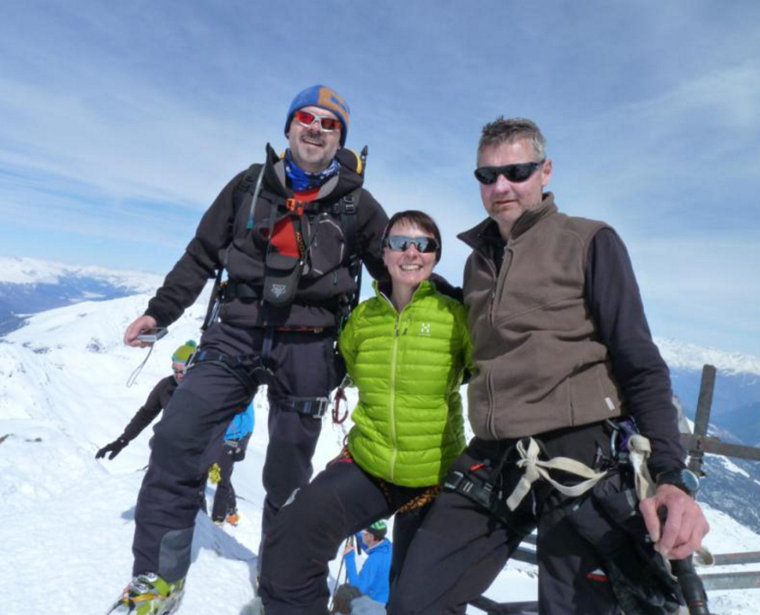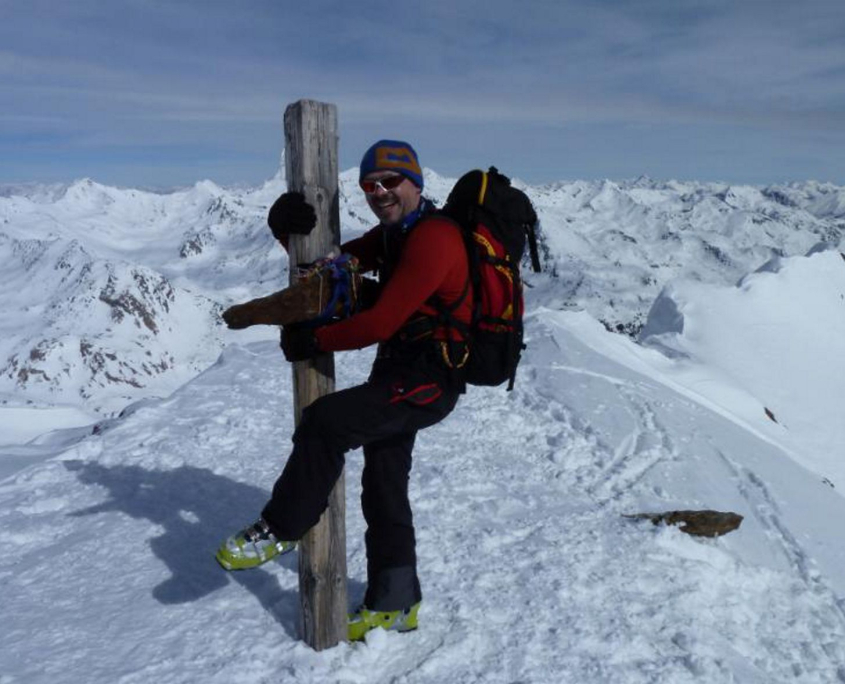 Am 4. Tag trennt sich die Gruppe. Alex und Klaus fahren direkt zum Parkplatz ab, wir 3 steigen um 6.30 Uhr zur östlichen Venezierspitze (3.357m) auf. Nach 3 Stunden erreichen wir das Skidepot und schon 20 min später den Gipfel. Obligatorisches Gipfelfoto, Vesper und auf zur Abfahrt. Schönster Pulver, mit mehreren Juchzern der Freude wedeln wir ins Tal. Die Zöpfe werden geflochten oder 3 Spuren nebeneinander gezogen, geil! Am Ende userer 1300m langen Abfahrt gibt’s noch Bruchharsch und `ne „Bobbahn“. Egal, nach einer super Abschlusstour treffen wir um kurz nach 12 Uhr, am Parkplatz, wieder auf Klaus und Alex. Noch gemeinsam Pizza essen auf der Heimfahrt, dann trennen sich die Wege ins Frankenland und in die Pfalz.