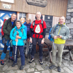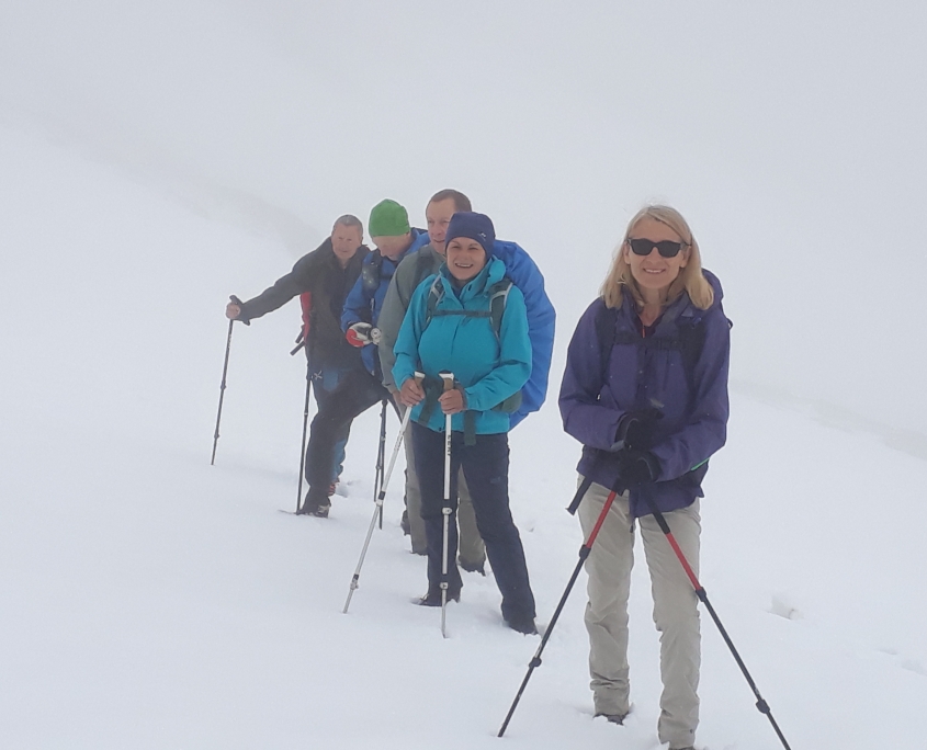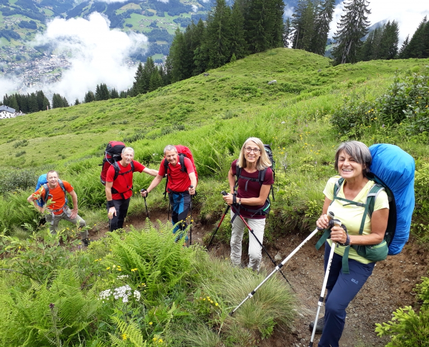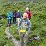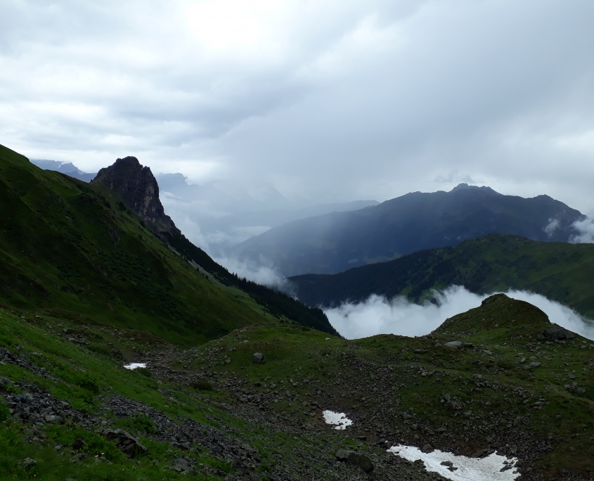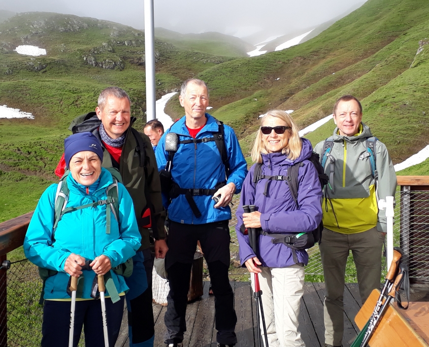 Bei trockener Witterung gingen wir los und kamen den Wolken immer näher. Zuerst über Kalkgestein, dann noch ein großes Schneefeld und schon standen wir am Gipfel. Inmitten von Wolken konnten wir die Aussicht nicht genießen, freuten uns trotzdem, auf dem Gipfel zu sein und trockenen Fußes die Hütte wieder zu erreichen. Am Nachmittag überschritten wir die Grenze zur Schweiz und erreichten bei teils kurzen Blicken auf die umliegenden Berge unseren Alpengasthof. Hier wurden wir vom Wirt fröhlich mit Weißwein empfangen und verbrachten einen wunderschönen Abend mit Musik, Tanz und Essen vom Grill.