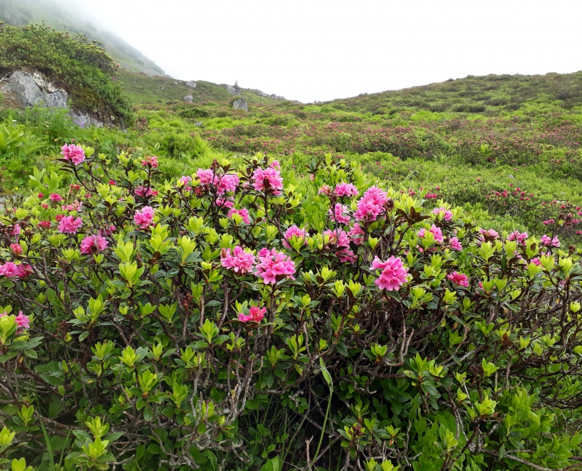 Am zweiten Tag mittags haben wir unseren höchsten Punkt der Tour erreicht – den Gipfel der Sulzfluh. Wir, das sind vier Pfälzer, ein Schweizer und ich aus Bayern. Wir haben uns am Donnerstag Mittag im Berggasthof Grabs getroffen. Allein die Autofahrt zu diesem Gasthaus war ein Abenteuer auf einer äußerst schmalen Straße mit extrem steil abfallenden Hängen. Der Himmel war wolkenverhangen, von der Umgebung haben wir nur ausschnittsweise geesehen, wie schön die Umgebung wäre und trotzdem war die Stimmung extrem gut. Wir sind den ganzen Tag an Hängen voller Alpenrosenblüten gewandert und kamen naß und etwas verfroren bei unserer ersten Hütte, der Tilisunahütte, an. Dort erholten wir uns schnell bei gutem Essen und waren gerüstet für die Sulzfluhbesteigung am nächsten Morgen.
