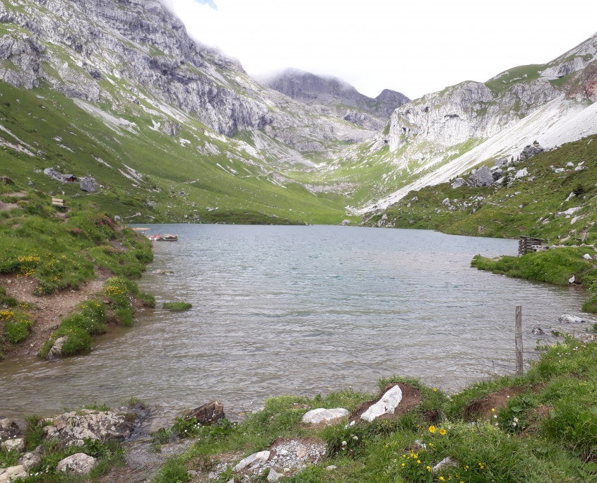 Der dritte Tag war noch etwas nässer und wir mussten genau aufpassen, wohin wir traten. Die Hänge und Wiesen waren klatschnass und die Wege rutschig. Aus diesem Grund machten wir eine ausgiebige Mittagspause in der Carschinahütte und stiegen dann den langen, steinigen Weg durch das Drusentor zur Lindauer Hütte ab.