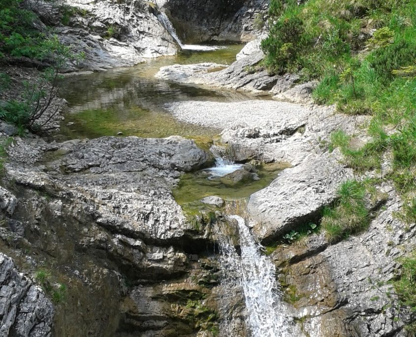 Nach einem reichlichen Frühstück machten wir uns um 8.30 Uhr auf den Weg in Richtung Bodenschneidhaus. Der Weg war sehr abwechslungsreich und führte über blühende Almwiesen und an dem Highlight, dem Pfanngraben, vorbei. Der Weg führte teilweise über große Wurzeln und Steine. Mehrmals überquerten wir kleine Bäche. Mal mit, mal ohne Brücke. Aber wo die Brücke fehlt, lagen genug große Felsen herum, auf denen wir die Bäche überquerten. Dann wand sich der Bach immer tiefer unter uns. Direkt neben dem Weg fiel der Fels immer steiler ab. Der Blick von oben in die enge Schlucht war sehr beeindruckend. In vielen Stufen fällt das Wasser in tiefgrüne Gumpen. Eigentlich mochte man gleich reinspringen, was einige auch an zugänglichen Stellen machten, beziehungsweise zumindest die Füße reinstreckten. Nach einer erfrischenden Pause ging es dann auf einem Waldweg Richtung Spitzingsee über die Albert-Link -Hütte ( 1053m), wo wir eine Vesper-Pause machten. Nachdem der ursprünglich geplante Weg zum Bodenschneid wegen Waldarbeiten gesperrt war, entschieden sich die meisten mit der Stümpfling-Bahn diese Strecke zu überbrücken. Der „harte Kern“ beschloß den Fahrweg hoch zu gehen, wo man von herunter rasenden Go-Kart-Fahrern eingestaubt wurde. Dann ging es ab dem Stümpfling-Sattel über den Suttenstein auf den Bodenschneid (1667m). Von dort aus hatten wir einen herrlichen Blick, trotz diesigem Wetter, auf den Tegernsee und unsere nächste Hütte. Der Abstieg war sehr steinig und steil. Nachdem wir unten waren, hatten wir das Bodenschneid-Haus (1365m) direkt vor Augen. Nach dem Bezug des Lagers/der Zimmer ging es direkt zum Abendessen, wobei die Hüttenwirtin was „Extrawünsche“ anging, sehr speziell war. Am Abend wurden wir dann noch zum Johannes-Feuer eingeladen, welches die hiesigen Jugend organisiert hatte. Nach dem Aufwärmen am Feuer saßen wir noch gemütlich in der Hütte zusammen.
