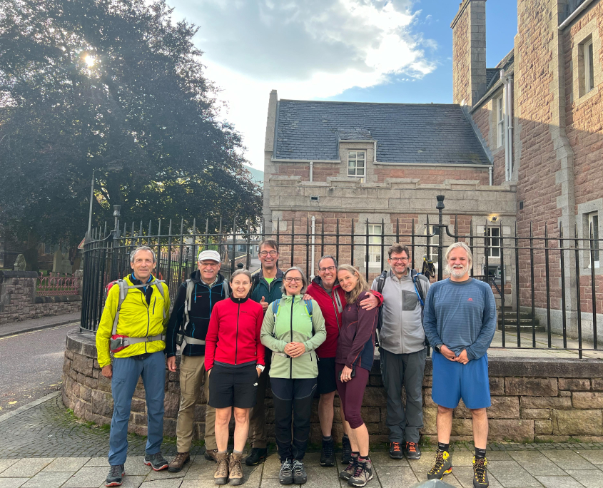 Um 5:00 Uhr morgens klingelt der Wecker. Müde, aber der erste Kaffee schmeckt trotzdem in der Frühe, macht aber nicht wirklich wach. Ein letzter Check: Reisepass, Kreditkarte, ein paar Pfund, Sonnencreme und ein Mückenschutzmittel, sowie Regenjacke und -hose. Alles im Rucksack verstaut und dann geht es zum Flughafen Frankfurt. Dort treffen sich ALLE. Ein großes Hallo, den viele kennt man von anderen Wanderungen des DAV Landau. Wir checken ein und der Flieger startet mit einer kleinen Verzögerung um 11:30 Uhr, was der Vorfreude auf Schottland nichts nimmt. Nach der Landung in Glasgow, geht’s weiter mit dem Taxi nach Fort William. 2:30 Stunden über eine enge Landstraße, Linksverkehr und einem Taxifahrer, der so schottisch spricht, dass man ihn kaum verstehen kann, und einem gewagten Fahrstil, so dass Uta und Olga, die vorne sitzen, schnell das Gespräch mit dem Taxifahrer einstellen. Es geht vorbei an Seen und teilweise schon herbstlich gefärbter Landschaft. Die Eindrücke machen Lust und gute Laune auf mehr. Unsere erste Unterkunft ist die „Bank Street Lodge“, in der wir 3 Nächte bleiben. Leider haben unsere Tourleiter, Christian und Thomas, teilweise dem Brexit geschuldet, nicht die Unterkünfte buchen können, die sie ursprünglich geplant hatten. Die Preise waren entweder extrem gestiegen oder die Unterkünfte hatten dauerhaft geschlossen. Die Beiden haben umgeplant, was dem Spaß, der Anstrengung, den Eindrücken und der guten Laune an der Tour nichts genommen hat. Ein Steinschlag von der Unterkunft kehren wir (auf Empfehlung von unserem Taxifahrer) im „The Grog & Gruel“ ein. Der erste Haggis wird probiert und es bleibt auf der Tour nicht das letzte. Und wie sollte es anders sein, das erste Pint schmeckt immer am besten. Als wir die Rechnung bekommen, lernen wir, dass es in Schottland nicht üblich ist getrennt zu zahlen. Wir bekommen eine Sammelrechnung. Uups 🤔. Kurzerhand wird die Gesamtsumme durch 9 geteilt. Wir können auch unkompliziert. Müde fallen wir gegen 22 Uhr ins Bett.