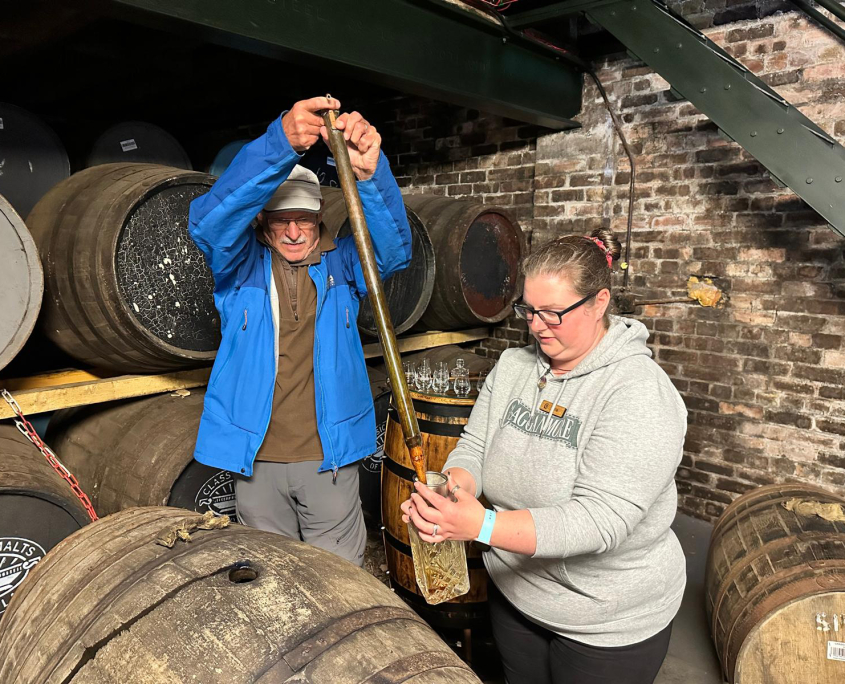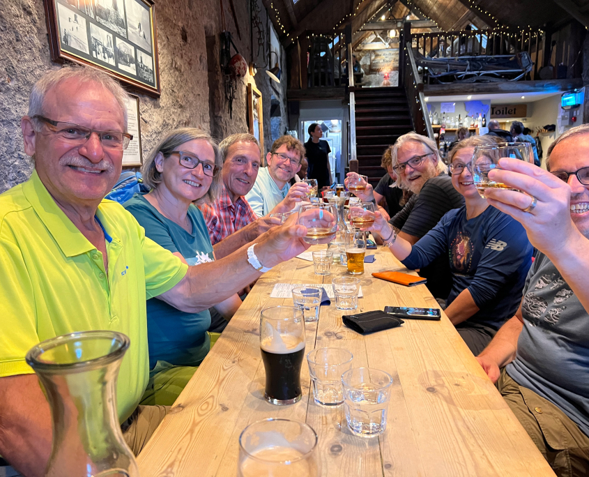 Zu Schottland gehört aber nicht nur Wandern, sondern auch Whisky. Daher ist heute ein Besuch in einer Destillerie vorgesehen. Hier kann man nicht einfach, wie bei einem Winzer in der Pfalz, vorbeischauen, wir haben aber noch einen „Time-Slot“ in der Craggenmore Destillerie für heute Nachmittag buchen können. Daher fahren wir zunächst mit dem Bus zum Schloss Ballindalloch – das älteste noch bewohnte Castle in Schottland. Für unsere „elderly aged pensionairs“ erhalten wir noch einen Rabatt für den Eintritt. Vom Schloss wandern wir dann weiter zur Destillerie. Hier erfahren wir wie Whisky hergestellt wird, und letztlich nichts anderes ist als destilliertes Weizenbier, wobei dazu das Malz auch geräuchert wird. Danach lagert der Whisky über viele Jahre in unterschiedlichen Holzfässern wie zum Beispiel in Sherry oder Bourbon Fässern. Zurück nach Grantown fahren wir mit dem Taxi von Carol, die genauso schnell spricht, wie sie fährt.