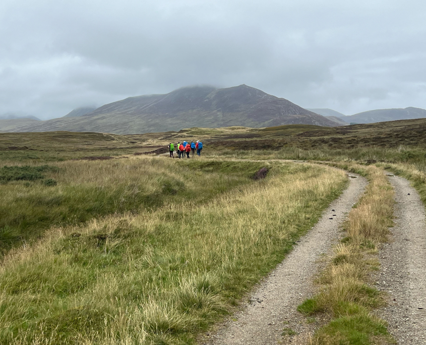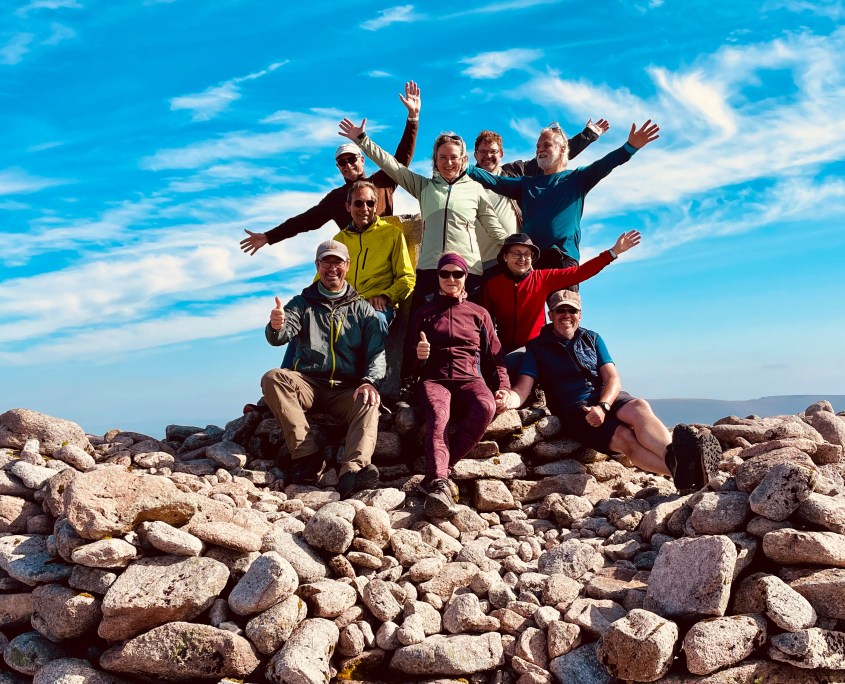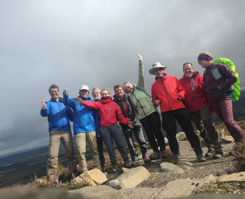Der Aufstieg von der Nord-Ost-Flanke war aber dennoch fordernd. Es ging ziemlich steil auf felsigem Untergrund, teilweise unmarkiert nach oben, aber immer wieder mit Absätzen. Wie vorhergesagt hatte es aufgehört zu regnen, so dass der Boden inzwischen wieder trocken war, was hilfreich war. Am Gipfel angekommen konnten wir die grandiose Aussicht in alle Himmelsrichtungen genießen. Nach einem Gruppenfoto ging es zum Abstieg, da es sich ja um einen Rundweg handelte, Richtung Süden. Dieser Abstieg war kein Vergleich zum Aufstieg. Moderat ging es auf einem angelegten und gepflegten, angenehm zu gehenden Weg Richtung Tal. Danach wanderten wir wieder durch malerische Wälder zurück nach Kingussie.