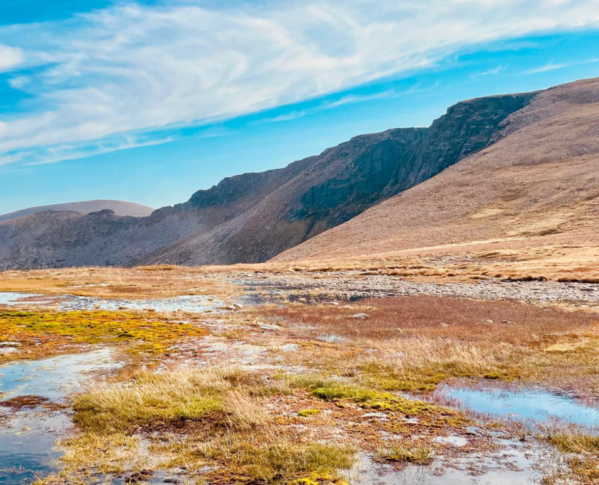 Mit dem Bus geht’s zum Cairngorm Mountain, einem beliebten Skigebiet und Ausgangspunkt für Wanderungen im Nationalpark. Unser Ziel ist der Ben Macdhui: in gut 2 Stunden schaffen wir unseren ersten Viertausender (4.296 ft) und stehen auf dem zweithöchsten Berg von Schottland/Großbritannien. Der Aufstieg bei herrlichem Wetter ist eher einfach, fasziniert aber durch die beeindruckende Weite und herrliche Farbigkeit. Kein Baum, kein Strauch, dafür blühende Heidelandschaft, karges Grasland, Bäche, Hochmoor, Geröll und Steinwüste. Der Gipfel ist sehr, sehr weiträumig und bietet heute klare Fernsicht mit ungewohnter, ortstypischer Farbkomposition. Auf dem Rückweg erfreuen wir uns an beeindruckenden Felsformationen und gut zu querenden Wasserläufen.