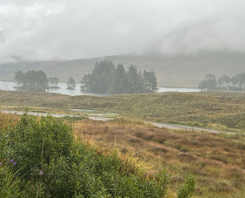 Bei kühlem, klarem Wetter verlassen wir unser schönes Ferienhaus bei Kingussie und machen uns auf den Weg nach Aviemore. Auf einsamen Wegen erfreuen wir uns an weiten Birkenwäldern mit knorrigen Bäumen voller Bartflechten und Baumpilze. Wir folgen klaren Wasserläufen, passieren moorige Wiesen und ausgedehntes Heideland. Für Liebhaber von Wildfrüchten gab es eine Snackpause im Heidelbeerwald. Nach Loch Insh, beliebt bei Wassersportlern, überqueren wir den River Spey und lassen uns bei Kincraig im Old Post Office Cafe mit leckerem Kuchen und Kaffee verwöhnen. Weiter durch hügelige Heidelandschaft und Kiefernwäldchen, später Weideland mit neugierigen Hochlandrindern, erreichen wir Aviemore. Ein Ferienhaus in Ortsnähe dient uns für die nächsten beiden Tage als Unterkunft. Der beliebte Ferienort im Cairngorm Nationalpark, ist derzeit gut besucht, die Restaurants ausgebucht, sodass uns ein Chinamenü alternativlos erscheint. Das war allerdings kein Highlight!