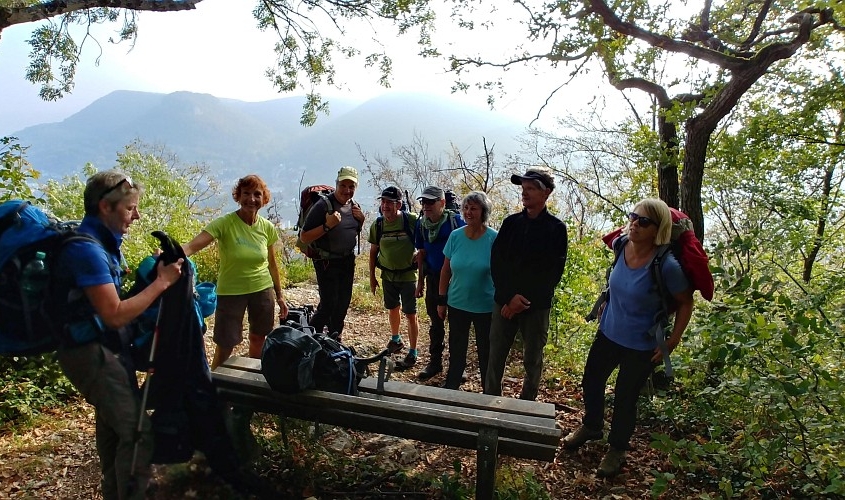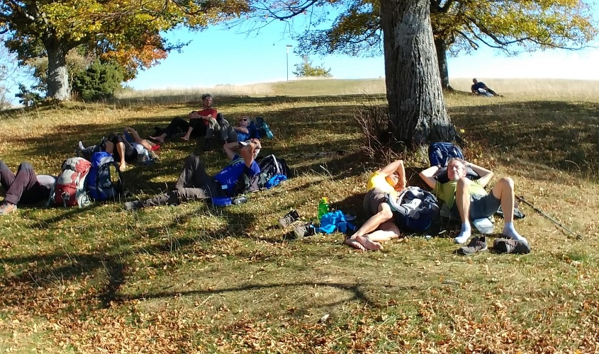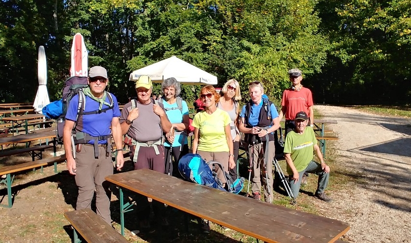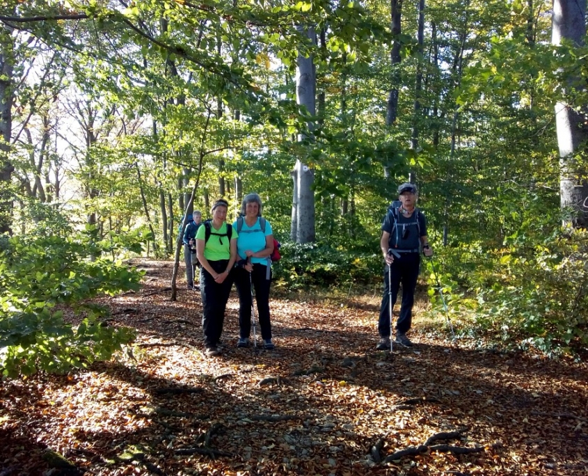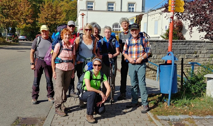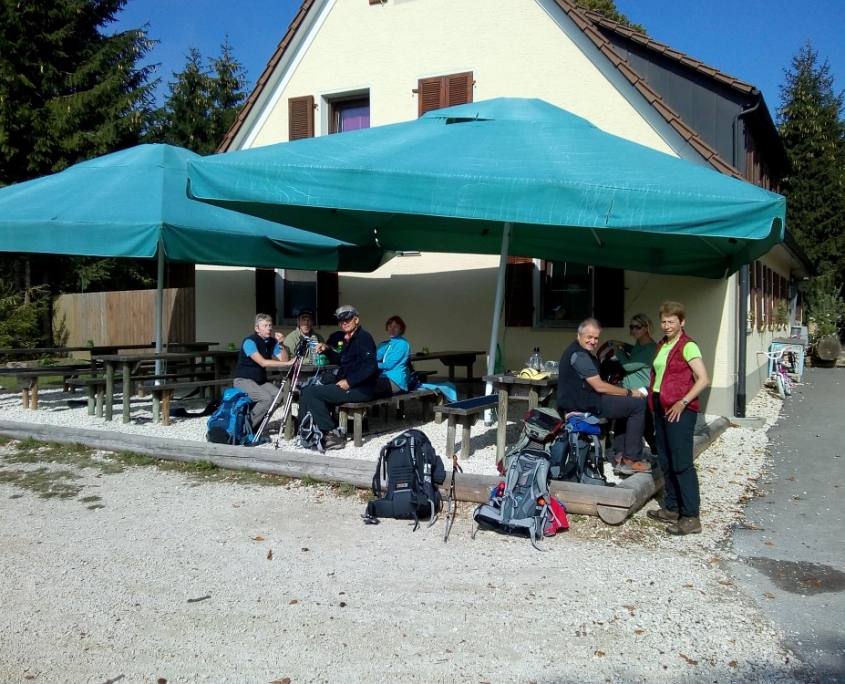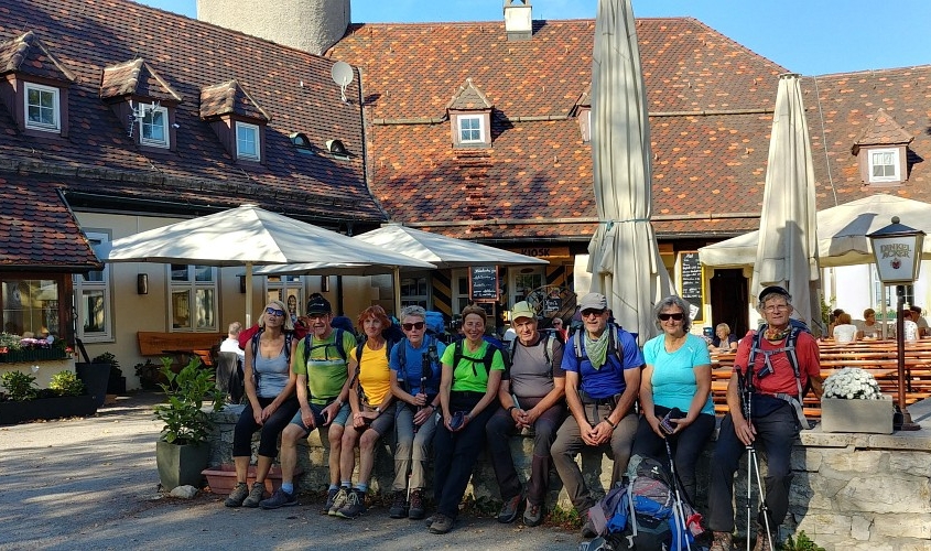 Und das hat sich wahrhaftig gelohnt. Wir hatten eine wunderbare Woche. 5 Frauen und 4 Männer, ein lustiges Wanderteam, wir hatten fast nur Sonnenschein und haben herrliche Herbsteindrücke mitgenommen. Am Samstag, den 6. Oktober steigen um 12 Uhr in Bopfingen aus dem Zug, genau dort wo die Schwäbische Ost-Alb beginnt. Bopfingen ist beherrscht vom Ipf, einem kegelförmigen Rundberg aus frühkeltischer Zeit, den wir rechts liegen lassen. Unser Weg führt uns entlang der Abbruchkante der Schwäbischen Alb, also dem Albtrauf, vorbei am Schönen Stein nach Hülen bei Lauterheim zu unserem 1. Etappenziel. Schloss Kapfenburg grüßt von weitem. Wir ziehen aber weiter, weil der Pensions-Wirt für uns das schwäbische Nationalgericht Gericht vorbereitet hat: Spätzle mit Linsen und Saiten.(15 km, 300 Hm). Früh am nächsten Morgen gehen wir über den Römerhöhenweg, der ehemals Straßburg mit Regensburg verbunden hat, nach Oberkochen. Unterwegs passieren wir die idyllisch gelegene Kocherquelle. Jetzt ist wird’s spirituell: unser schwäbischer Wanderführer Thomas wird mit dem glasklaren Wasser der Kocher getauft. Aus einem Schwaben ist jetzt ein waschechter Schwabe geworden! Nach einer Kaffeepause in Unterkochen, erreichen wir unser Ziel nach 30 km und 550 Hm; das war die längste Strecke. Heute ist Montag und wir erkunden den Ursprung der Schwarzen Kocher. Sobald wir den Bodennebel durchbrochen haben, erreichen wir den 743 m hoch gelegenen Volkmarsberg. Ein herrlicher Platz zur Rast. Über die Ruine Rosenstein, wo wir wieder einen großartigen Fernblick genießen, machen wir uns auf nach Heubach, einem Ort am Rande des Remstals. Außer gutem Bier gibt es in Heubach noch die Fa. Triumph, die mit unserem Erscheinen den Umsatz im Sonderverkauf kräftig ankurbeln kann. Wir übernachten im Goldenen Hirsch, einer Brauerei mit Gasthof und lassen uns nach 22 km und 400 Hm ordentlich verwöhnen. Ein goldener Oktobertag wie aus dem Bilderbuch, führt uns am nächsten Tag über das Naturfreundehaus Himmelreich zum Bargauer Horn, einem schönen Aussichtspunkt umgeben von leuchtenden Laubwälder. Wir folgen immer dem mit rotem Dreieck gekennzeichnetem Fernwandweg Ostalb und oft werden wir von der blauen Pilgermuschel auf weißem Grund begleitet. Unser Höhenweg verläuft auf 750 m. Natürlich sind täglich Auf- und Abstiege im Wanderprogramm, weil die Abbruchkante von Ortschaften unterbrochen wird, die romantisch in der Talebene liegen. Unser heutiges Ziel ist Weißenstein bei Lauterstein nach 21 km und 550 Hm. Der Silberdistel-Wirt erwartet uns bereits mit selbst gebackenem Kuchen und verschenkt so viel Gastfreundlichkeit, dass wir uns sofort wohl fühlen. Im Ställe, einem urigen Biker-Treff, lassen wir den Tag ausklingen. Der nächste Tag beginnt mit leichtem Gepäck, steilem Anstieg am Fuße des privaten Märchenschlosses Weißenstein und überrascht uns mit etwas Wind und Regen. Jetzt haben wir Gelegenheit beim Anstieg auf den Hochberg und beim Abstieg nach Gingen an der Fils die raue Alb kennen zu lernen. Nach der Mittagspause laufen wir wieder bei Sonnenschein auf 700 m Höhe über die Wacholderheide und erreichen nach stolzen 27 km und 750 Hm das NFH Wasserberg. Unser freundlicher Silberdistel-Wirt und seine Frau holen uns dort in der Nähe ab. Drei von uns zufällig bei ihm im Auto Sitzenden zeigt dieser liebenswerte Wahlschwabe aus dem Kosovo seine Strickfabrik in Lauterheim. Ein wirklich interessantes technisches Intermezzo. Das gestrige Streckenende ist der Beginn von heute dank des organisierten Transfers. Der schwäbische Höhenweg wird bei fast 800 m auf der Boßlinger und dann auf der Härtlinger Steige fortgesetzt. Bei strahlendem Sonnenschein machen wir Mittagsrast auf dem NFH Boßler (leider geschlossen). Wir kommen an den Jahrhundertsteinen vorbei, die mit 100 Worten in Stein gehauene positive und negative Meilensteine des letzten Jahrhunderts erzählen. Einige lädierte Knie und Wehwehchen brauchen heute eine Erholungspause und nehmen deshalb den direkten Weg nach Neidlingen. Die Anderen gehen weiter direkt am Albtrauf entlang, erleben immer wieder fantastische Ausblicke und steigen bei der Ruine Reußenstein nach 25 km und 650 Hm nach Neidlingen ab. Am nächsten Tag geht es wieder steil bergauf zur sehr schön restaurierten Ruine Reußenstein, direkt gelegen an der Abbruchkante der schwäbischen Kalkfelsen, die im Tertiär im Jurameer lagen. Ein Panoramablick von 300 Grad lässt die Blicke über die sich in sanften Bögen schlängelnden Höhenzüge der vergangenen Tage gleiten. Unser heutiger Wanderweg führt durch den Bannwald, dem Urwald von morgen und öffnet den Blick auf viele Streuobstwiesen und die bewaldeten Höhenzüge. Die Mittagsrast findet zwischen Silberdisteln und Großen Mehlbeer-Bäumen statt mit direktem Blick auf den Breitenstein. Nach teilweise schwierigen Passagen erreichen wir nach 19 km und 700 Hm gegen 15.30 Uhr das Wanderheim auf Burg Teck. Ein genialer Rundblick vom dortigen Aussichtsturm macht uns die Schwäbische Alb unvergesslich. Wir genießen bei Sonnenuntergang den letzten Abend in der Burgschänke, bevor es am nächsten Morgen zur Heimreise nach Owen an den Bahnhof geht. Wir haben es alle geschafft und sind glücklich und stolz manche Strapazen gemeistert zu haben.
