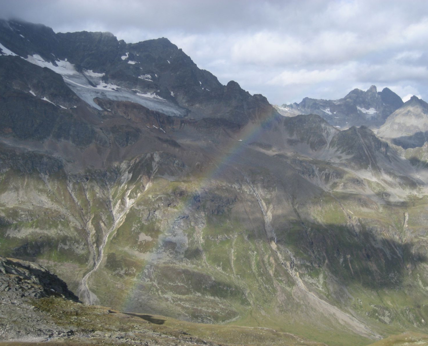 Bald gehen wir wieder zurück auf den „Radsattel“ und weiter über Blockwerk und kleinere Schneefelder auf die „Radschulter“ (2697m). Auf der Westseite der „Radschulter“ erhebt sich der Gipfel „Hohes Rad“ (2934m). Hier trennen wir uns von der anderen Gruppe und beginnen um 10:45 Uhr den Abstieg auf zur Bielerhöhe am Silvretta-Stausee (2035m). Die ersten 100 Höhenmeter geht es steil über ein, mit Sand und Geröll durchsetztes, Blockwerk hinunter. Nach dem Blockwerk gehen wir weiter bergab und machen gegen 12:15 Uhr eine kurze Rast. Das Wetter ist immer noch ganz in Ordnung – ab und zu blinzelt die Sonne durch die Wolken und unten im Tal breitet sich ein kleiner Regenbogen aus. Nach kurzer Zeit gehen wir weiter, der Weg führt uns über Wiesen und an Felsen vorbei, bis wir um 14 Uhr den Silvretta-Stausee erreichen. Hier machen wir eine etwas verspätete Mittagspause. An der Westseite des Stausees geht es um 15 Uhr zurück zur Wiesbadener Hütte, die wir über den „Fahrweg“ bei leichtem Regenwetter gegen 17 Uhr erreichen.