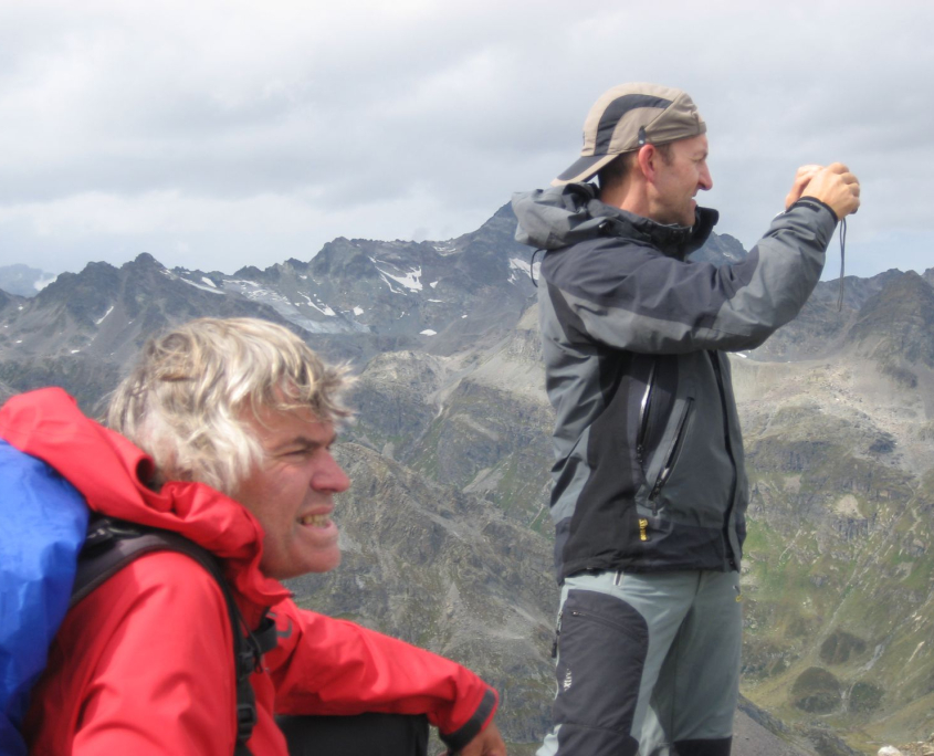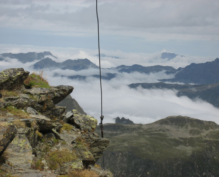 Um 9:30 Uhr erreichen wir den „Radsattel“ (2652m). Von hier aus gehen wir noch einen kleinen Abstecher auf einen kleinen benachbarten Gipfel (2701m). Dort am Gipfelkreuz genießen wir den Ausblick auf die Vorarlberger und Tiroler Alpen.