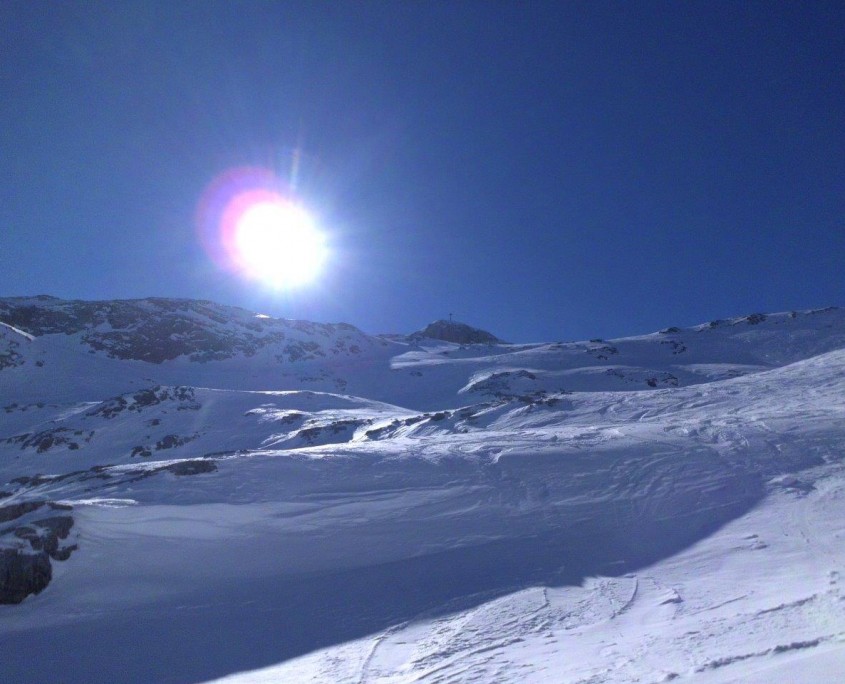 100 Höhenmeter unterhalb des Gipfels bleibt Heino zurück, der Rest zirkelt sich weiter nach oben und erreicht um 13 Uhr den Skigipfel! Obligatorisches Gipfelfoto, schnell abfellen und anschnallen, da es windet. Wir fahren bis in den kleinen Sattel zu Heino ab und dort dann die verdiehnte Pause. Jetzt kommen die steilen Passagen der Abfahrt über die 2. Schlüsselstelle. Aber alle kommen gut an dem Sporasattel an. Hier wechseln wir und fahren nicht über die Aufstiegsspur, sondern durch den Sporatobel weiter ab. Ich quäle mich ziemlich in dem windverblasenen harten Schnee oder Bruchharsch, aber wir kommen sicher unten an. Hier geht es dann auf einem Art Ziehweg Richtung Hütte. Um 15 Uhr sitzen wir beim Gipfelbier und stoßen auf den tollen Tag , mit einer anspruchsvollen Skitour bei Traumwetter, an!!