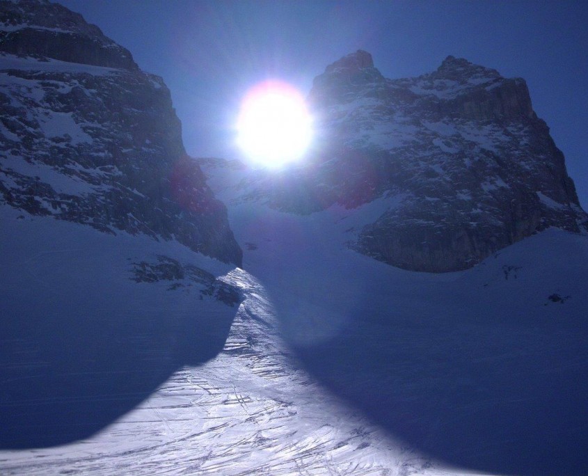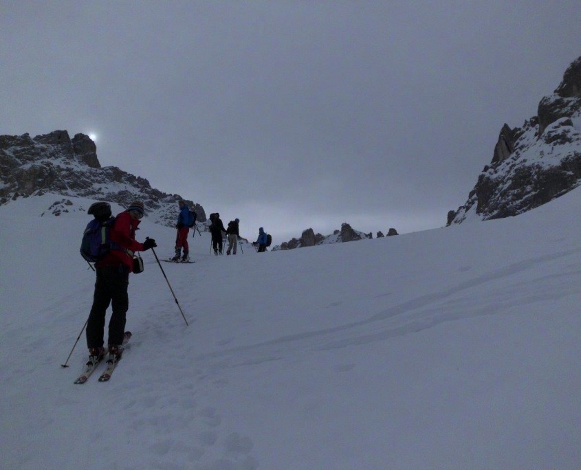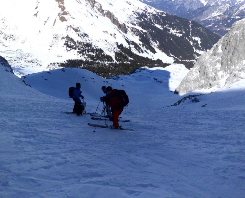 Nach einem ausgiebigem Frühstück starten wir um 9 Uhr und laufen auf dem Sommerweg, der sich sehr steil den Hang hinauf schlängelt. Sichere Spitzkehrentechnik, die uns Markus perfekt vorführt, ist in der glatten Spur wichtig. An der 1. Schlüsselstelle, einer Querung eines 40°-44° steilen Hanges, schnallen wir die Ski ab und tragen sie ein Stück. Dann geht’s wieder auf den Skiern weiter. Nach einer kleinen sonnigen Rast im Sporasattel geht es wieder in unzähligen Spitzkehren über die 2. Schlüsselstelle, wieder 40° bis 44°, diesmal auf Ski, Richtung Gipfel.