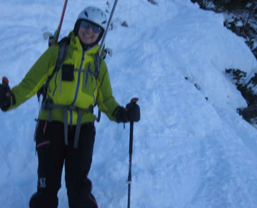 7 Uhr Frühstück, 8 Uhr Abfahrt auf dem Schlittenweg bis ca 100 Hm unterhalb der Hütte. Hier wechseln wir in den Wald und schlängeln uns Richtung Fuß des Latschenwäldchens, der 1. und einzigsten Schlüsselstelle der Tour. Hier geht es auf 60 Hm in 42°bis 44° steilem Gelände nach oben. Zuerst ist die Spur sehr gut, dann heißt es abschnallen und die Ski auf den Rucksack. Dummerweise bricht mir beim Skiabschnallen die Spur weg und ich lande 2 Meter tiefer… In anstrengendem Tiefschneegewühl kämpfe ich mich wieder mit Hilfe von Lothar nach oben. Also dann die Ski auf den Rucksack und weiter aufwärts. Die Spur ist weiter sehr griffig und wir schrauben uns durch den Rachen Richtung Gipfel. 12 Uhr 15 stehen wir am Gipfelkreuz. Hier werden wir mit einem herrlichen Panorama belohnt. Nach einer Rast etwas unterhalb, windgeschützt geht es zur Abfahrt. Da der Schnee heute „homogener“ist, ist die Abfahrt, besonders durch den legendären Rachen, ein Genuß. Alle sind begeistert… Dann geht es weiter durch den Latschenwald in einer abenteuerlichen Abfahrt, mit Tragepassage, wieder zurück. Nach den 100 Hm Aufstieg kommen alle glücklich an der Hütte an. Wir lassen den schönen Tag mit einem gemütlichen Abend und viel Rotwein ausklingen.