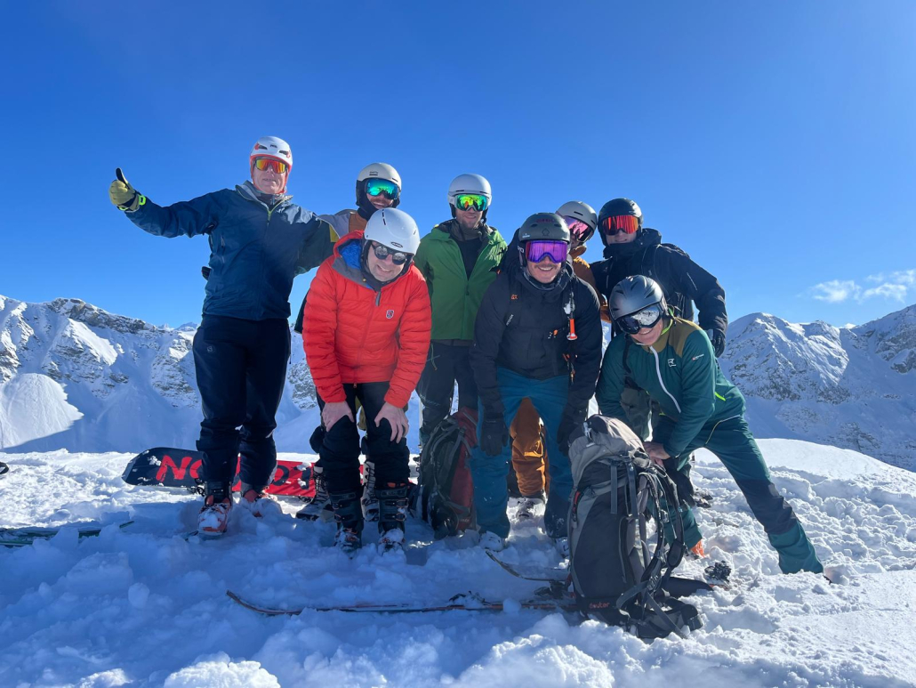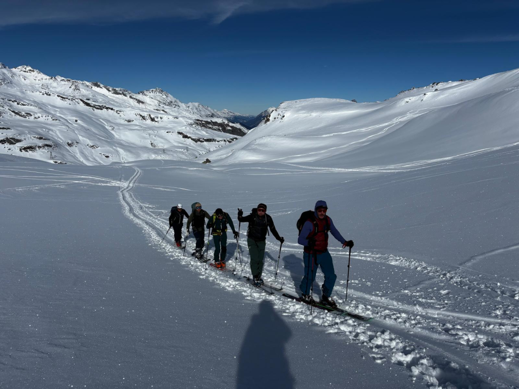 Am zweiten Tag ging es nach einem ausgezeichneten Frühstück direkt hinter dem Hotel auf den Piz Scalotta (2991 m). Die Schneeverhältnisse waren zunächst schwierig, verbesserten sich jedoch ab etwa 2400 Metern deutlich. Immer wieder hörten wir Setzungs- und Wummgeräusche, die uns an die angespannte Lawinensituation erinnerten und zu besonders defensivem, bewusstem Aufstieg führten. Die Abfahrt belohnte uns schließlich mit überraschend gutem Schnee. Für den dritten Tag war ursprünglich der Piz Surgonda (3195 m) geplant, doch die Schneesituation erwies sich als zu heikel, weshalb wir während der Tour flexibel umplanten und stattdessen den Piz Campagnung (2825 m) bestiegen. Diese Entscheidung war genau richtig: Die Tour war landschaftlich beeindruckend und die Abfahrt ein echtes Highlight.