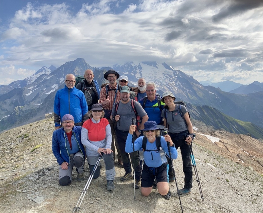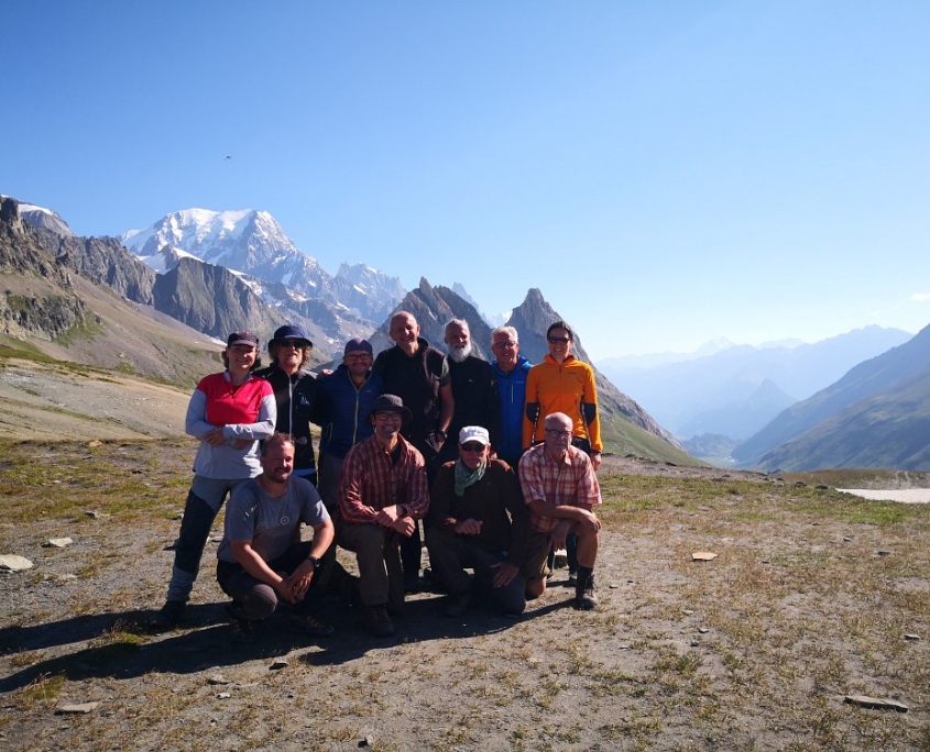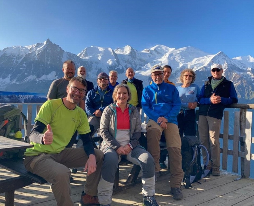 Die Choreografie dieser Tour hätte nicht besser sein können: Am Anfang ein Gewitter wie ein Paukenschlag, kalte Nächte, keine Decken und unser weißer Berg versteckt sich hinter Wolken. Doch dann wird das Wetter jeden Tag besser und nach einer Woche und 85 km im Halbkreis um den Mont Blanc strahlen die weißen Gletscher bei der Abreise vor einem stahlblauen Himmel. Unser Tourguide Thomas will uns wohl schon auf die Fortsetzung im nächsten Jahr einstimmen … ?