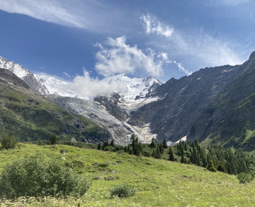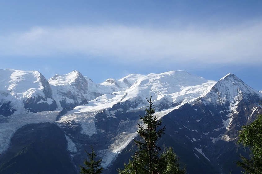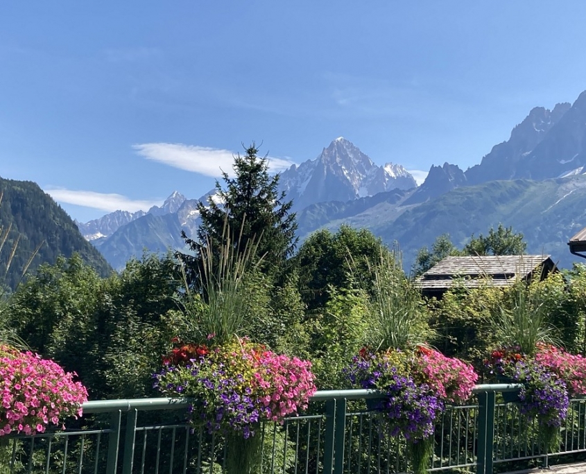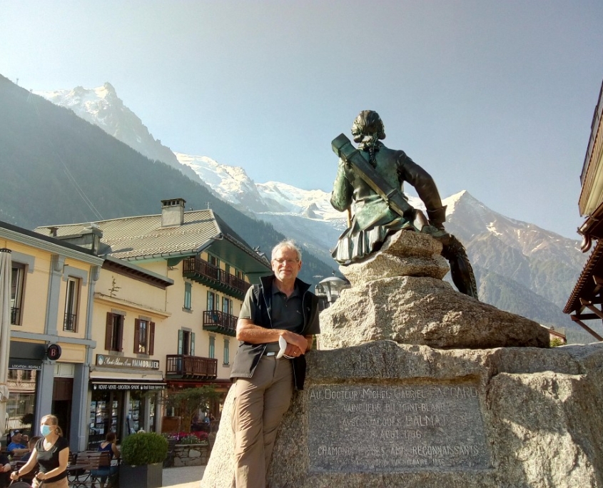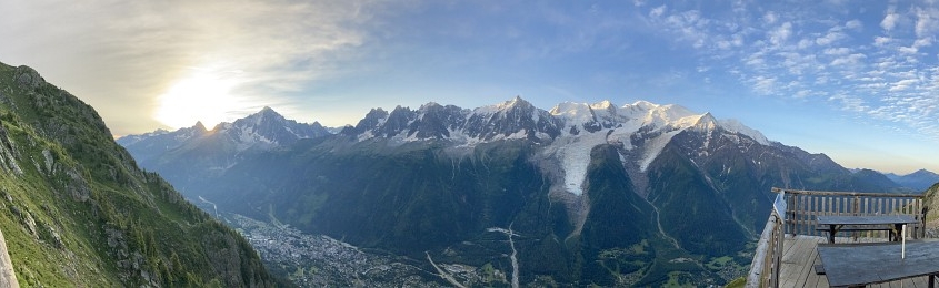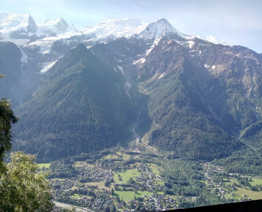Montag, 09.08.: Am Morgen haben wir zum ersten Mal eine tolle Aussicht auf die Gipfel des Mont Blanc. Von Belachat aus geht es einen steilen Pfad hinunter zu einer Christus-Statue (fast wie in Rio) und zu einem Rastplatz mit Aussicht auf Les Houches und die Autobahn. Nach einer kurzen Pause laufen wir hinab ins Tal. In Les Houches ist Markt. Ideal, um Brot und Käse einzukaufen. Mit der Seilbahn geht es dann hinauf nach La Chalette. Hier genießen wir die Mittagspause in Liegestühlen in der Sonne. Außerdem gibt es am Kiosk Bier und ein erstes Omelett für Lothar. Frisch gestärkt laufen wir über die Gleise der Zahnradbad (Tramway du Mont Blanc) und weiter einen schönen Pfad hinab zu einer Hängebrücke über den Bionnassey-Gletscherbach. Hier gibt es einen Stau – denn Wanderer aus beiden Richtungen wollen Selfies machen. Auf der anderen Seite müssen wir alle verlorenen Höhenmeter – und noch einige mehr – wieder gutmachen: in einem mühsamen Anstieg zum Col du Tricot (2120 m). Und auf der anderen Seite geht es wieder steil hinab ins Tal (Merke: Bei Thomas werden die Höhenmeter bergab nicht gezählt!). Hier kann Stefan zum ersten Mal zeigen, wie er den Berg hinab „fliegt“ und uns dann wieder entgegenläuft. Das wird den Rest der Strecke über so bleiben – er trainiert für den UTMB, die „Mutter aller Bergläufe“, der in einer Woche stattfindet. Unten angekommen lockt das Chalet Miage mit Bier und Wein. Aber erst nach Vorzeigen unserer Corona-Nachweise. (Übrigens fast das einzige Mal auf der gesamten Tour, dass das kontrolliert wird. Danach nur noch in der Jugendherberge in Chamonix.)