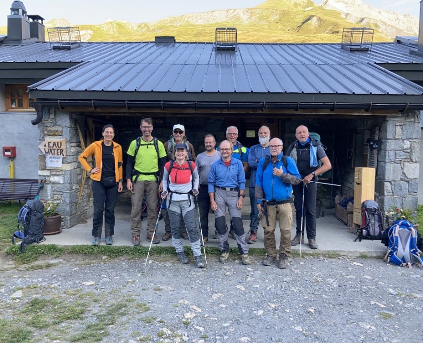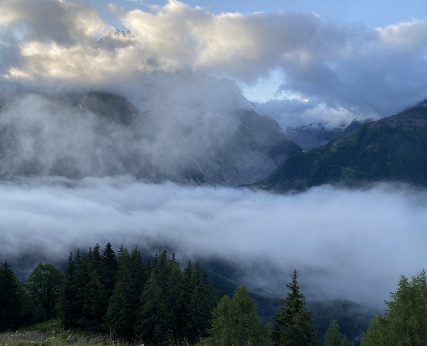 Samstag, 07.08.: Wir reisen mit 2 Fahrzeugen aus unterschiedlichen Richtungen bei schönstem Wetter und ohne Staus nach Chamonix (1037 m) an, wo wir uns alle zehn pünktlich an der Talstation La Flégère treffen. Da der Wetterbericht Gewitter vorhersagt, machen wir uns schnell auf den steilen Weg zur ersten Hütte. Es reicht nicht ganz. Nach ca. 2/3 der Strecke kommen Donner und Regen. Aber das heftige Gewitter setzt erst ein, nachdem wir auf dem Refuge de la Flégère (1877 m) angekommen sind. Glück gehabt! Ein sehr junges Team macht Hüttendienst und verwöhnt uns mit einem 4-Gänge-Menü, eins der besten Abendessen der ganzen Tour. Und auf Nachfrage bekommen wir sogar noch Decken für alle – trotz Corona.