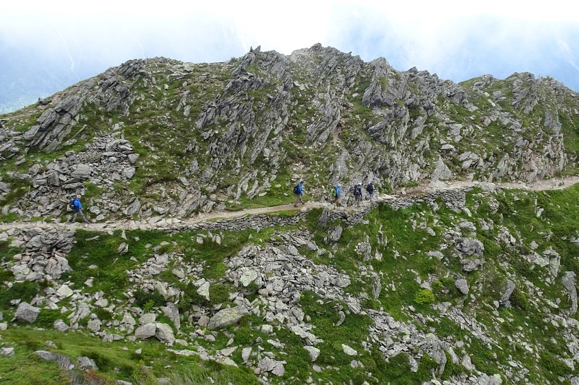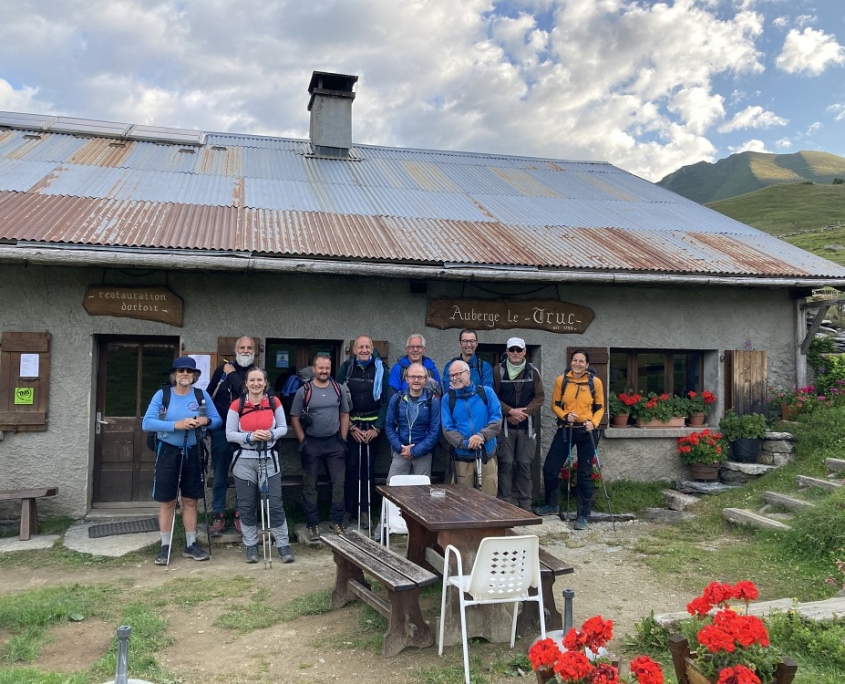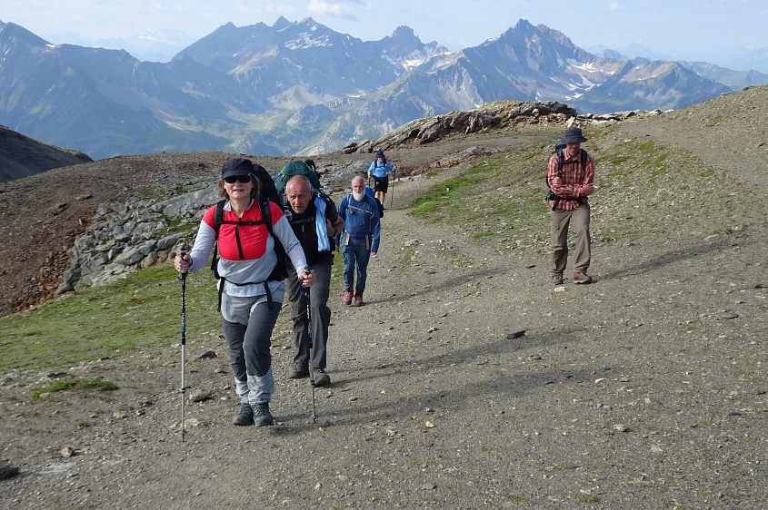 Dienstag, 10.08.: Heute kommt ein langer Tag! Zuerst geht es hinab nach Les Contamines, wo Christian und Uta sich erst mal neue Schlafsäcke kaufen – sie haben keine Lust auf weitere kalte Nächte. Über einen schönen Markt mit regionalen Produkten geht es weiter entlang dem Flüsschen Nant Borrant bis zur Kirche Notre Dame de la Gorge. Bis hierher machen wir schnell Kilometer. Doch dann folgt wieder ein sehr langgezogener Aufstieg. Nur unterbrochen von der Mittagspause an der Hütte La Balme laufen danach alle einzeln ihr Tempo bis hinauf zum Pass Col du Bonhomme (2329 m). Und obwohl wir dachten, dass der Anstieg hier beendet ist, geht es auch danach noch stetig bergauf. Und nach jeder Kurve folgt wieder eine neue Kurve. Auf einem ziemlich unwegsamen Pfad kommen uns immer wieder Mountainbiker entgegen. Und dann sind wir endlich am Ziel: Kurz unterhalb des Col de la Croix du Bonhomme (2479 m) liegt das Refuge de la Croix du Bonhomme, eine ziemlich große Hütte. Wieder sind es junge Leute, die sie bewirtschaften. Etwas chaotisch – aber sehr nett. Und wir bekommen sogar wieder Decken. Der Hüttenwirt sagt: „Eigentlich darf ich euch keine geben – wegen Covid! Aber erfrieren sollt ihr ja auch nicht.“ Und die langersehnte Dusche für (fast) alle gibt es auch.