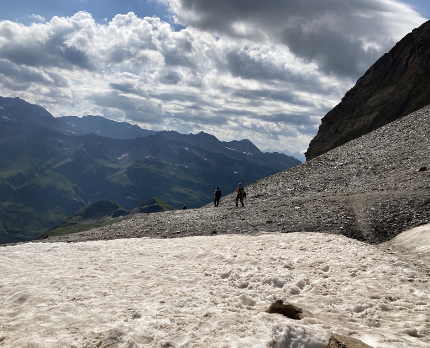 Donnerstag, 12.08.: Am Morgen steigen wir hinauf zum Col de la Seigne (2516 m), der Grenze zwischen Frankreich und Italien. Und hier haben wir den besten Ausblick der gesamten Tour. Kein Wölkchen am Himmel und der Mont Blanc mit weißen Gipfeln, Gletscherzungen und vielen weiteren Zacken direkt vor uns. Dieser Blick begleitet uns den ganzen Tag bei unserem Abstieg vorbei an einem Infozentrum hinab ins Tal. Beim Rifugio Elisabetta machen wir Mittagspause, bereuen das aber schnell, weil wir nicht auf die Terrasse dürfen, wenn wir nur etwas trinken. Daher picknicken wir auf der Wiese, bevor es weiter hinab geht. Unten sehen wir eine riesige, von Geröll bedeckte Gletschermoräne vor uns. der Weg dahin verläuft schnurgerade über eine Wanderautobahn. Man hat das Gefühl, in einer Fußgängerzone zu sein und nicht in den Bergen – so viel ist hier los. Das ändert sich wieder als wir am Fuß der Moräne einen schmalen Weg rechts hinaufnehmen. Schnell gewinnen wir wieder an Höhe, genießen die großartige Aussicht und laufen weiter zum Rifugio La Maison Vieille am Col Checroui (1956 m). Das ist eine richtige Skihütte, mitten im Skigebiet von Courmayeur mit einer aufgedrehten Hüttenwirtin, die den Laden aber im Griff hat. Am Abend gibt es ein leckeres italienisches Menü mit Pasta zur Vorspeise und Fleisch mit Gemüse. Hier ist es hilfreich, dass Christian so gut italienisch spricht.