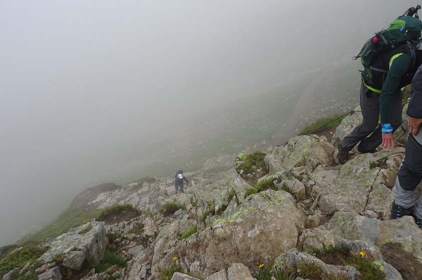 Sonntag, 08.08.: Heute geht es um 9 Uhr gemütlich los – in der Hoffnung, dass die Wolken sich verziehen und einen Blick auf den Mont Blanc freigeben, denn heute laufen wir auf dem Südbalkon oberhalb von Chamonix. Aber keine Chance – die Sicht bleibt schlecht. Trotzdem kommen wir um die Mittagszeit zu einer Absprungstelle für Paraglider, wo es vor lauter Springern wimmelt. Todesmutig wagen sie sich in Tandems in die Tiefe – direkt unterhalb der Seilbahn und mitten hinein in die Wolken. Da braucht man schon viel Gottvertrauen.