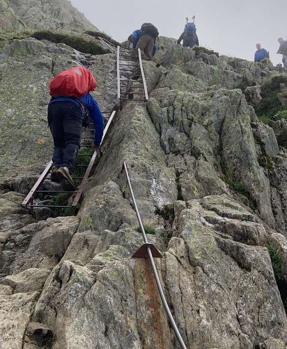 Wir steigen stattdessen gut gesichert über ein paar Leitern nach oben hinauf auf den Brévent (2525 m). Weil es ziemlich kalt ist, genießen wir anschließend einen heißen Kaffee im Gipfel-Restaurant. Und danach laufen wir hinab zu unserer zweiten Hütte: Refuge du Belachat. Eine sehr kleine und urige Hütte. Aber das Abendessen ist knapp bemessen, das (Steh-)Klo befindet sich draußen und es gibt nur für die Hälfte von uns Decken. Die anderen müssen frieren. Da hat es unser 11. Wanderer besser: Stefan reist in der Nacht an und schläft mit Schlafsack und Isomatte draußen auf der Terrasse – ihm ist es warm.