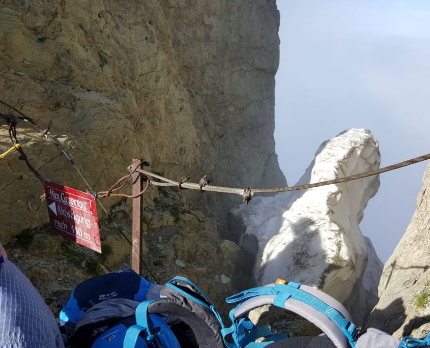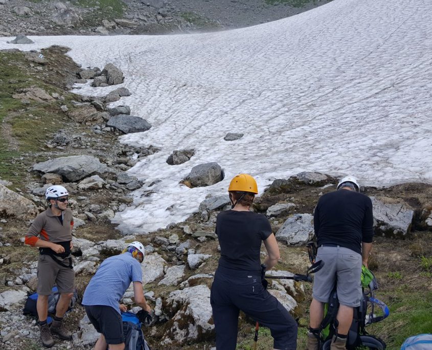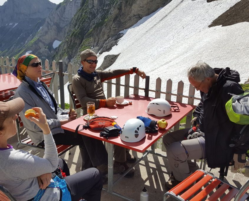Bei herrlichem Wetter und ca. 14 Grad C ging es am nächsten Morgen direkt in den zweiten Klettersteig über den Liesengrat Steig zum Rotsteinhaus. Der Steig war perfekt gesichert und auch für Anfänger gut geeignet. Nach kurzer Pause und dem Sichten von den ersten Gämsen sicherten wir uns den Altmannsteig zum Altmannsattel hoch. Joachim und Andy gingen noch hoch auf den Gipfel des Altmannsattels (2.435 m), der Rest der Truppe genoss die Pause und den Ausblick. Nach dem Abstieg, zum Teil wieder über Schneefelder, kamen wir über das Löchlibetter zur Häderen Hütten (1.738) wo uns einige Kühe bei einer Rast Gesellschaft leisteten. Der letzte Anstieg über Wiesenwege, durch kniehohen Blumen, so daß der Weg zum Teil nicht mehr sichtbar war, führte uns zur Zwinglipasshütte, einer Hütte des schweizerischen Alpenvereins auf 2.000 Hm. Gemütlich, urig und richtig nette Bewirtung, mit Spagetti aus dem Topf. Von dort sahen wir dann die vielen Steinböcke die ihr abendliche Spielereien vor uns vorführten. Auch die Murmeltiere konnten wir aus unmittelbarer Nähe beobachten.
