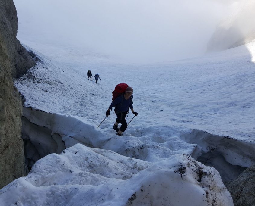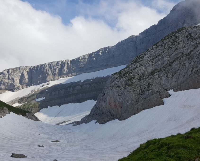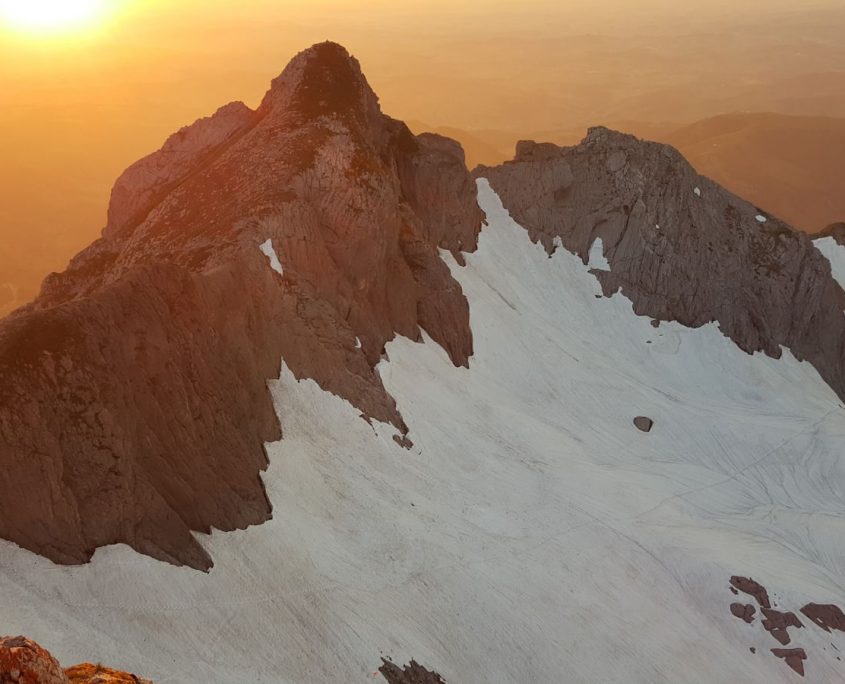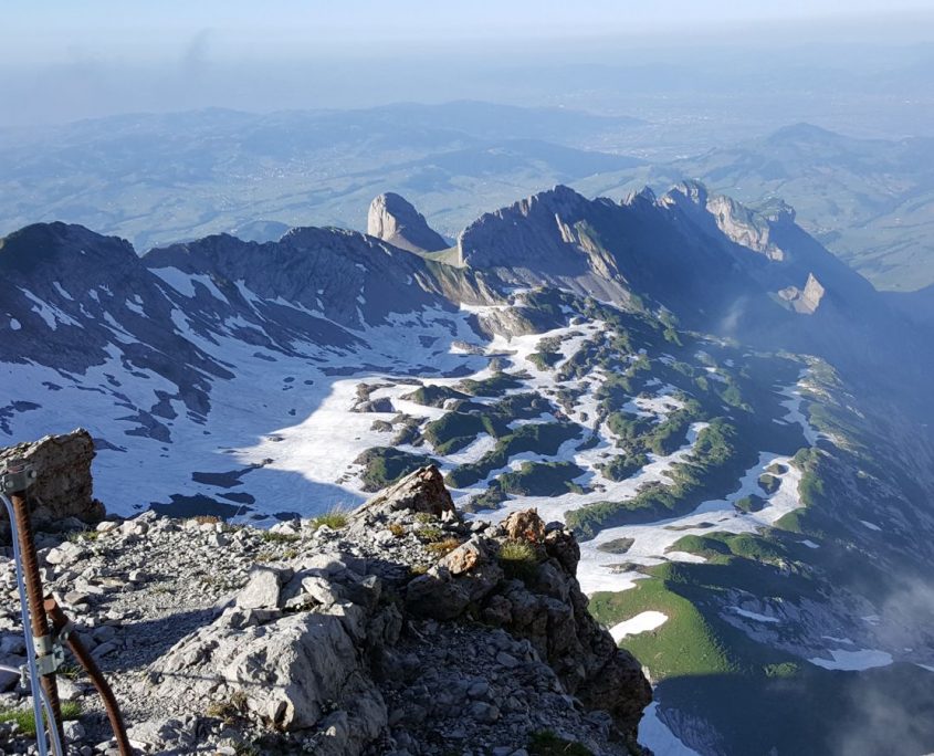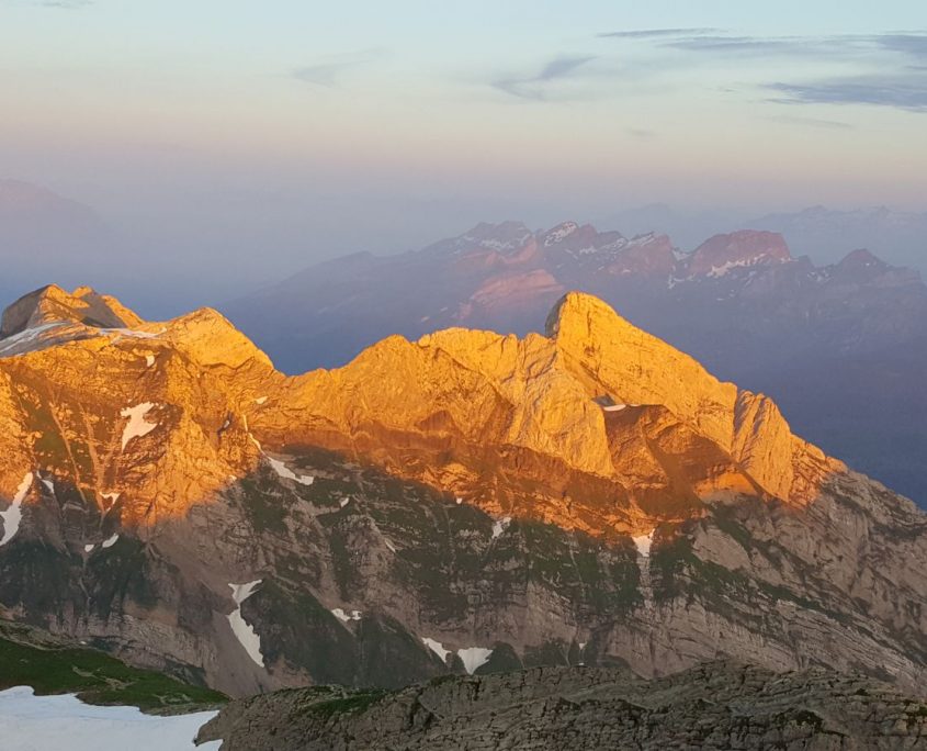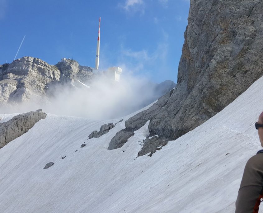 Nach der Stärkung ging es erstmal zu den 7 Hütten und den 3 Hütten, weiter auf einem steilen Wiesenweg an den Nasenlöchern vorbei durch eine Wand. Nach kurzer Kletterei im KS Nasenlöcherweg ging es weiter auf leichtem Gelände den Berg hinauf. Auf ca. 2.000 Höhenmetern überquerten wir die ersten Schneefelder. Joachim bereitet uns den Weg vorbildlich, so dass wir diese zügig bewältigten. Die letzten 100 Meter zur Säntis Hütte waren abenteuerlich, da der Steig mit Schnee bedeckt war, aber auch diese Stellen wurde von Allen super passiert. Das Säntis Haus mit Wetterstation (2.502) liegt außergewöhnlich exponiert mit wunderschönem Blick auf den Bodensee. Der Sonnenuntergang war einzigartig, die Berge leuchteten.