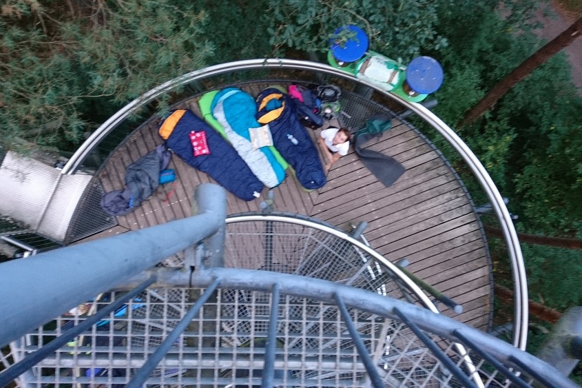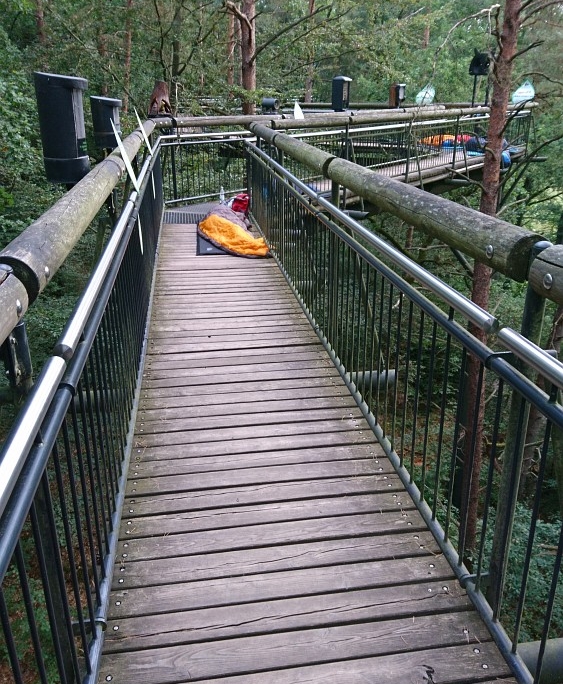 Am späteren Nachmittag kamen so 6 neugierige Familien und schlugen Ihr Nachtquartier auf den Stegen des Baumwipfelpfades auf.
