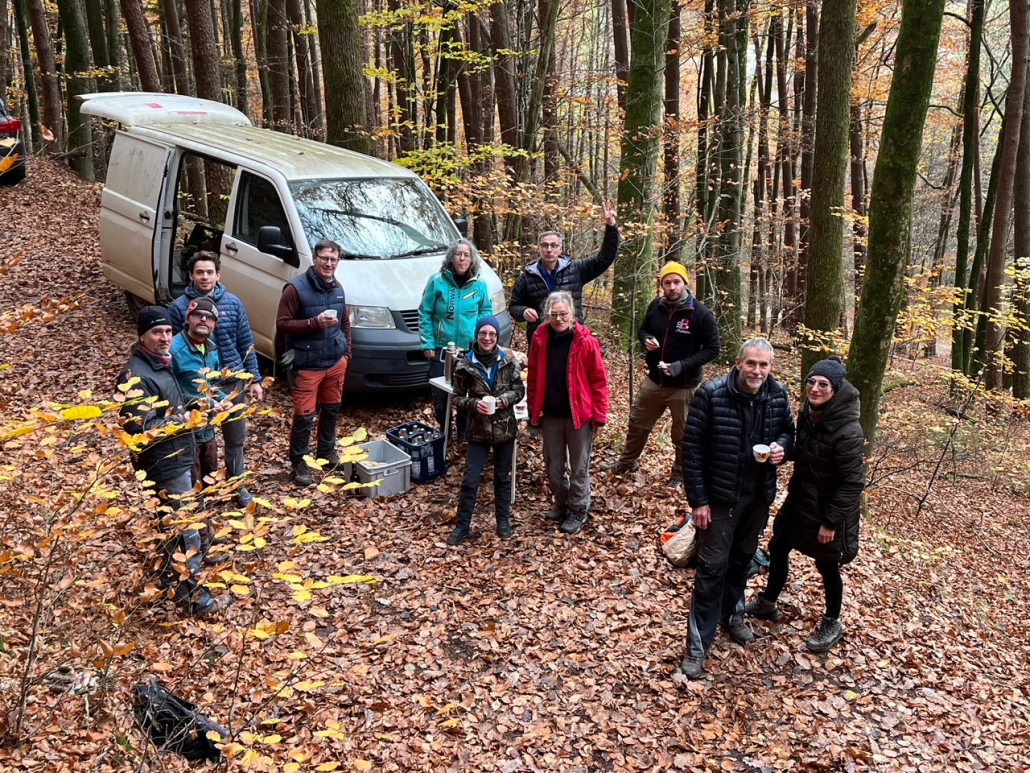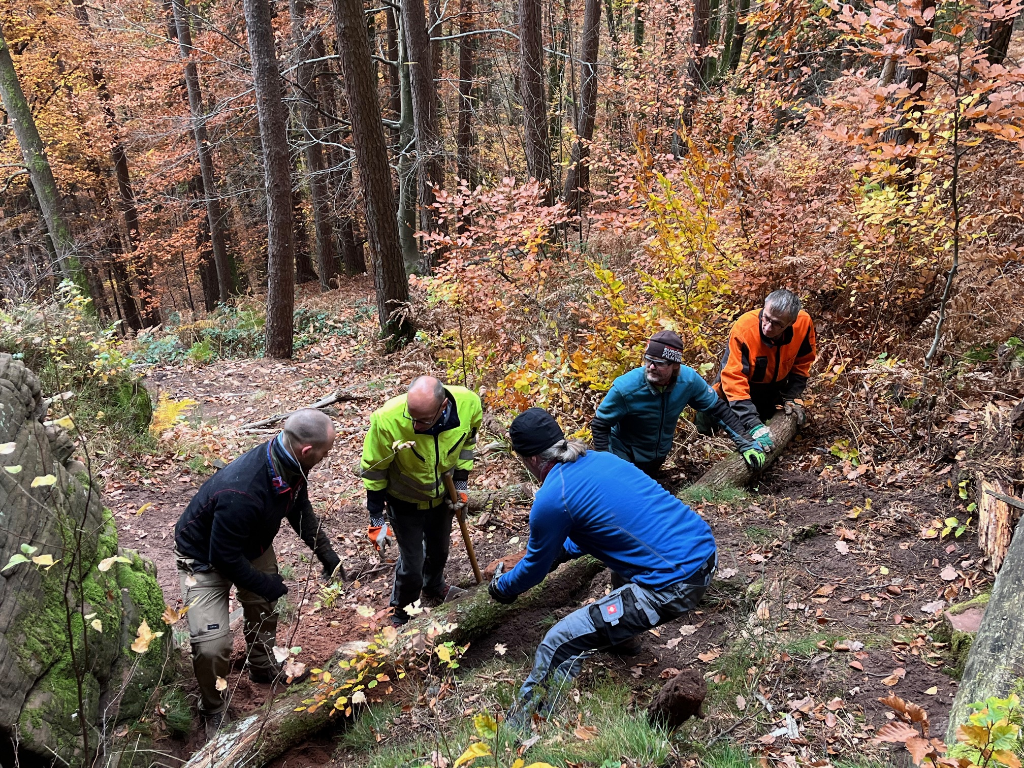 Zusammen mit den Pfälzer Kletterern haben wir am Samstag, 08.11.2025 den Zustiegsweg und den Einstieg zum Ostgipfel der Drei Felsen saniert. Bei kaltem, aber trockenem Wetter haben wir Stufen, Treppen und Podeste mit umliegendem Totholz erneuert.