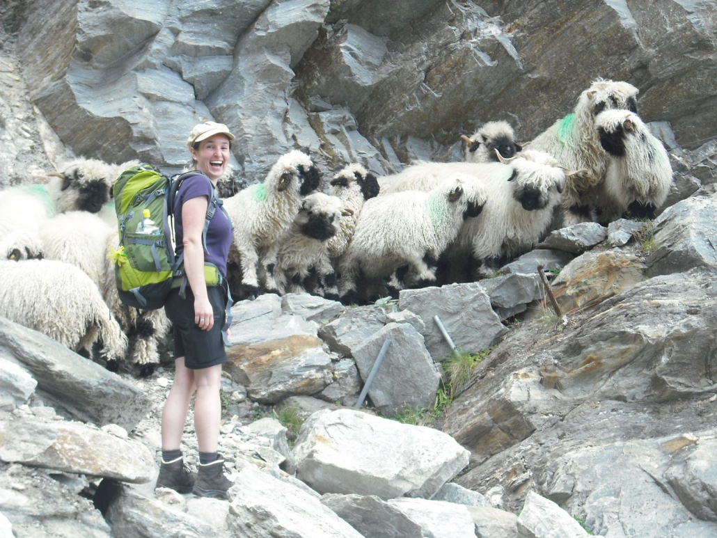 Nach einem guten Frühstück sind wir mit dem Bus nach Saas Fee gefahren, um dort die schwerste Etappe unserer Wanderung anzugehen, den Europaweg von Saas Fee Richtung Grächen, der sich weiter bis Zermatt zieht. Der Einstieg war nicht all zu schwer. Es ging recht flott einen gut beschilderten Weg entlang. Nach etwa einer Stunde entwickelte sich der Weg zu einem immer schmäler werdenden Pfad, der es in sich hatte. Mit einer Breite von ca. 80-100cm ging es entlang an steilen Felswänden und gefühlten 1000m tiefen Abgründen! Nichts für zart besaitete Gemüter. Da muss man bei der Sache bleiben und sich konzentrieren. Unser Team meisterte den Weg mit Bravour. Auf dem Weg selbst hatten wir mit Gämsen, Steinböcken, Schwarzmaulschafen nicht nur Sicht- sondern Fellkontakt, ein sehr schönes Erlebnis, mit wild lebenden Tieren Auge in Auge auf dem Weg gegenüber zu stehen.