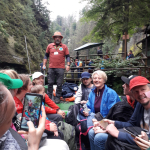 Bei der Eröffnungstour zum Großen Zschirnstein, mit 562 m höchster Berg der Sächsischen Schweiz, begleitete uns zeitweise Regen, die prächtige Aussicht von der Spitze war bei Nebel leider etwas getrübt. An diesem Tag erschloss sich uns endlich der Zeitgeist- Trend „Waldbaden“. Bis zum Kohlbornstein besserte sich dann das Wetter deutlich, so dass wir das Panorama zum Lilienstein genießen konnten. Nach Bittgebeten beim abschließenden Besuch der Barockkirche in Reinhardtsdorf folgten doch glatt Schönwettertage!
