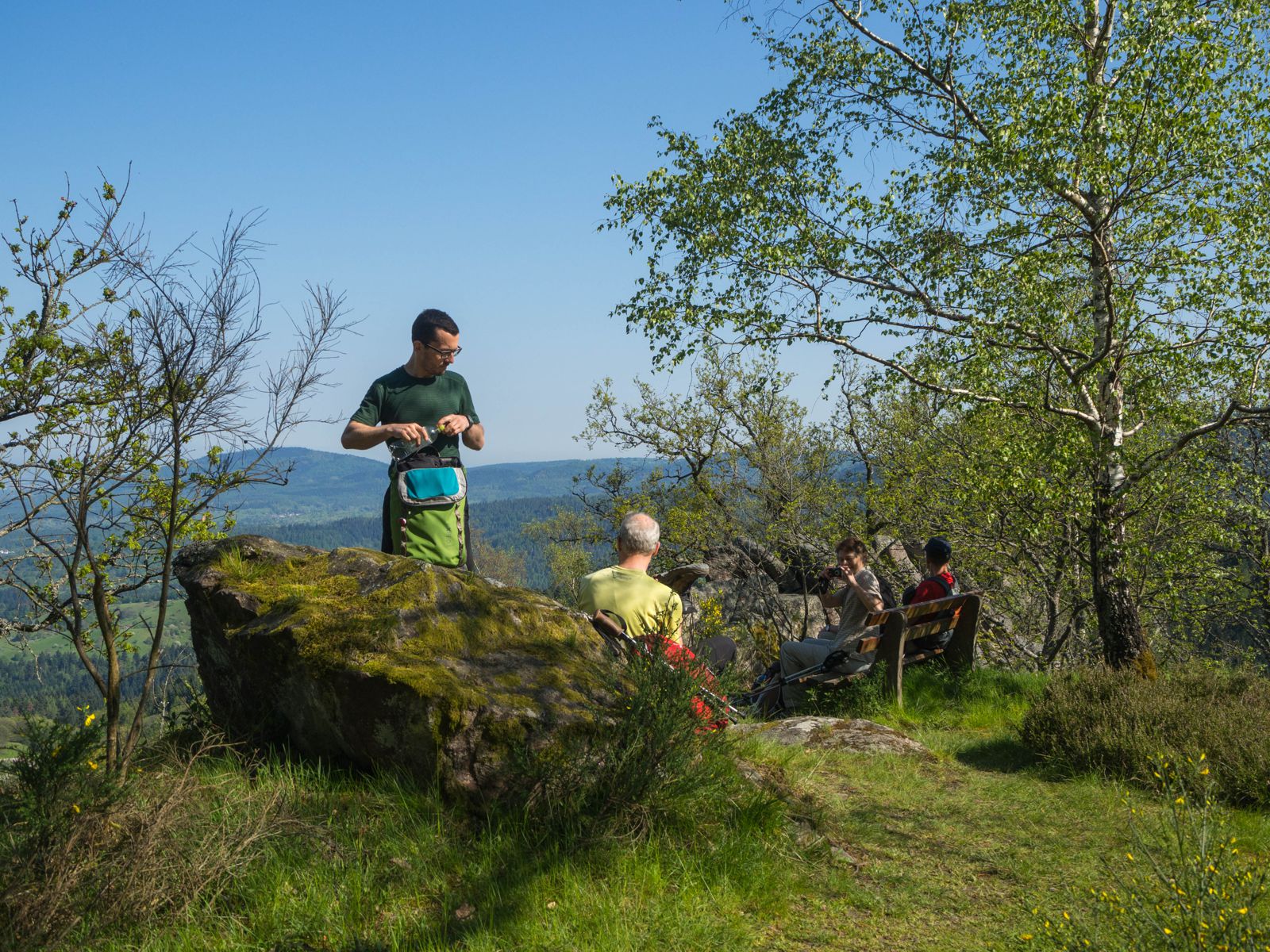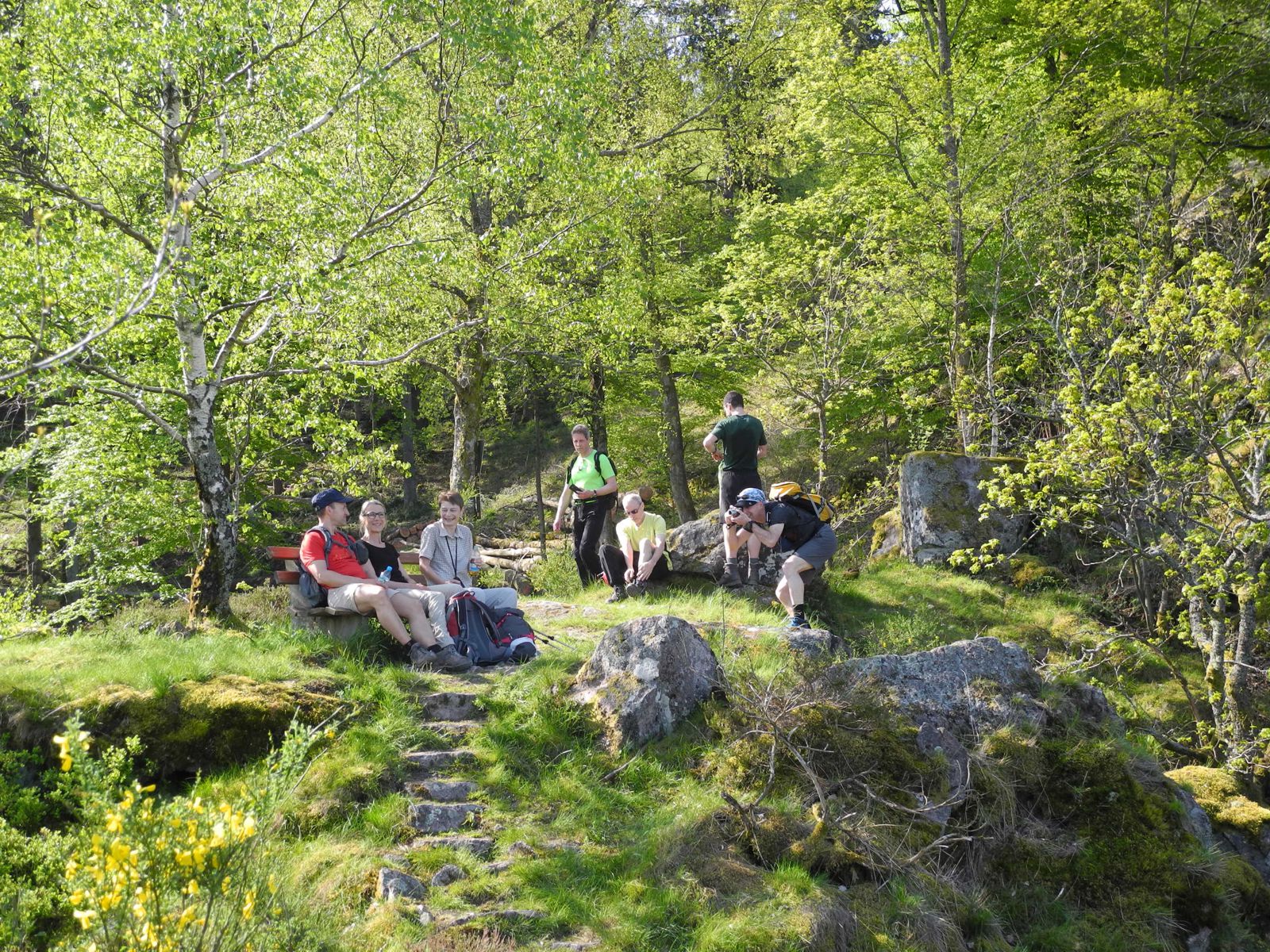 Um 7.30 Uhr starteten wir bei noch kühlen Temperaturen am Bahnhof in Gernsbach. Zunächst ging es eine halbe Stunde durch den Ort zum „offiziellen“ Startpunkt – dem Portal – am Parkplatz im Laufbachtal. Ab hier war der Weg mit der „Ebersteiner Rose“ markiert. Er führte uns am Laufbach entlang hinauf nach Loffenau und weiter in Richtung Lautenbach. Bei der Illertkapelle bogen wir links ab, um weiter hinauf zum Lautenfelsen zu wandern. Oben auf dem Fels, der sogar mit einem kleinen Gipfelkreuz ausgestattet war, machten wir eine kurze Pause und genossen den schönen Rundblick auf unsere nächsten Ziele und in die Rheinebene. Der weitere Weg führte über den Rockert hinab nach Reichental und noch weiter talwärts über einen künstlerisch gestalteten Weg bis nach Hilpertsau. Dort überquerten wir die Murg. Nun ging es wieder stetig bergauf, zunächst durch Wald, später durch Streuobstwiesen, an der Antoniuskapelle vorbei zum Schloss Eberstein. Auf der Platanenterrasse des Schlosses gönnten wir uns eine einstündige Pause. Danach ging es weiter hinauf zum höchsten Punkt unserer Wanderung: Dem Merkur (668 m). Leider blühte der Rhododendron im Bereich des Gipfels noch nicht. Aber wir wurden auf dem Aussichtsturm mit mit einem wunderbaren Rundblick belohnt. Das letzte Stück des Rundwegs führte uns wieder hinab ins Murgtal zum Bahnhof in Gernsbach, den wir um 19.10 Uhr erreichten.