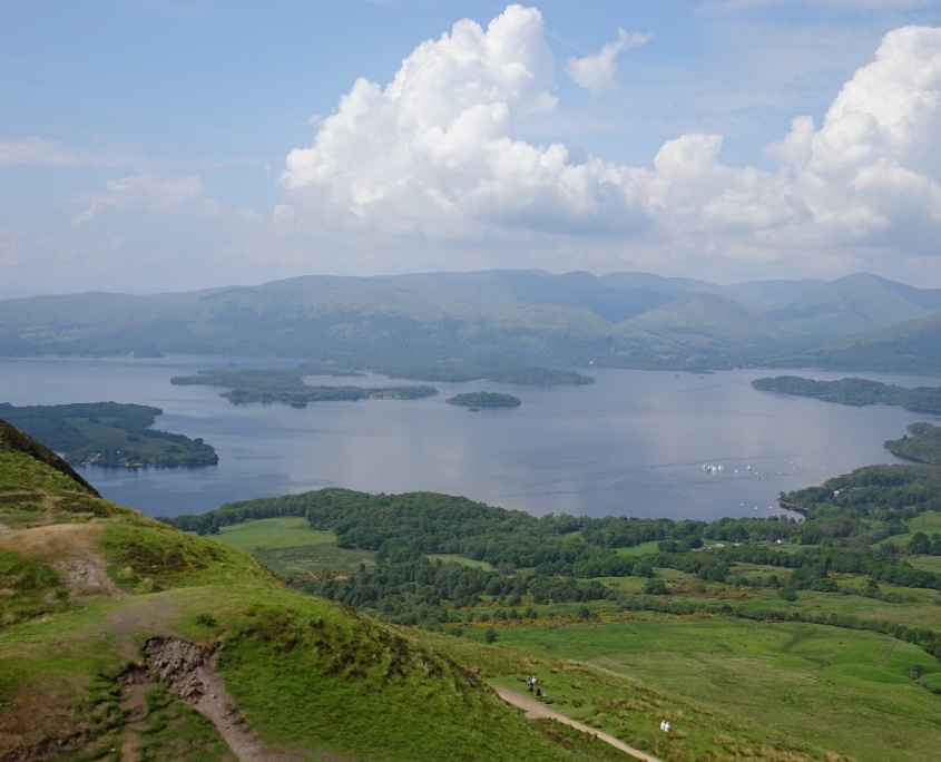 Zunächst führt unser Weg durch einfaches Wiesen- und Waldgelände. Nach ca. 2 Stunden Gehzeit haben wir erstmals Kontakt zum Loch Lomond, dem größten See Schottlands. Er wird die nächsten Tage unser ständiger Begleiter sein, bis wir die Highlands erreichen. Kurz vor Balmaha, einem beliebten Ausflugsziel und Beginn der Highlands, erklimmen wir den Conic Hill. Eine sehr schweißtreibende Angelegenheit. Am Gipfel angekommen werden wir jedoch mit einem wunderschönen Ausblick auf den Loch Lomond belohnt, den wir längere Zeit im Gras liegend genießen. In Balmaha selbst ist uns zu viel Trubel, so dass wir nach einer nur kurzen Rast immer am See entlang zu unserem nächsten Ziel dem „Rowardennan Lodge Youth Hostel weiterwandern. Nach etwa einer Stunde kommen wir dort an, rundum ziehen Gewitterwolken auf, die uns jedoch nichts mehr anhaben können. An der Jugendherberge, einem sehr schön gelegenen ehemaligen Jagdschloss, machen wir erste Bekanntschaft mit den schottischen Stechmücken, den Midgets, die in Scharen über uns herfallen und uns ordentlich „vermöbeln“.