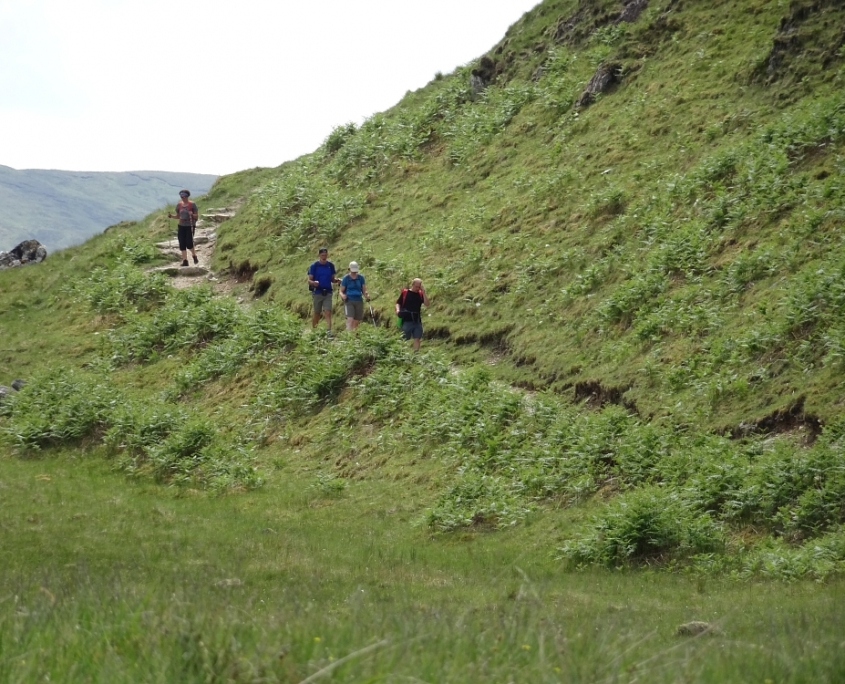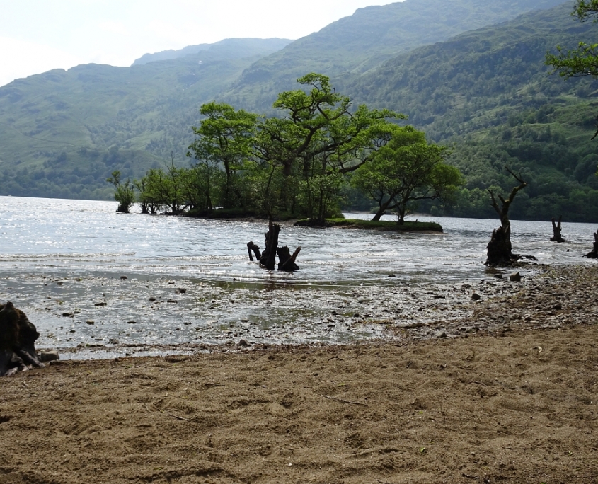 Unsere Route führt uns den ganzen Tag am See entlang. Zunächst gehen wir auf einem gut ausgebauten Wanderweg, in der zweiten Tageshälfte verläuft die Strecke nahe am Ufer steil und auch manchmal ausgesetzt über dem See, was Trittsicherheit und Schwindelfreiheit erfordert. Der Weg ist zwar nicht ganz ungefährlich, für einen geübten Bergwanderer jedoch ohne größere Schwierigkeiten zu bewältigen. Im schlimmsten Fall sorgt ein Ausrutscher für ein unfreiwilliges Bad im See. Die folgende Nacht verbringen wir im „Drovers Inn“, einem wirklich urigen Pub in dem die Männer Kilt tragen. Übrigens haben Inge und Sonja im Drovers Inn das Geheimnis des Schottenrocks „gelüftet“.