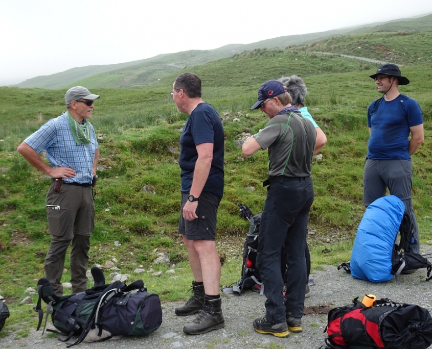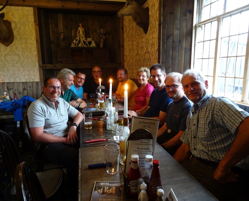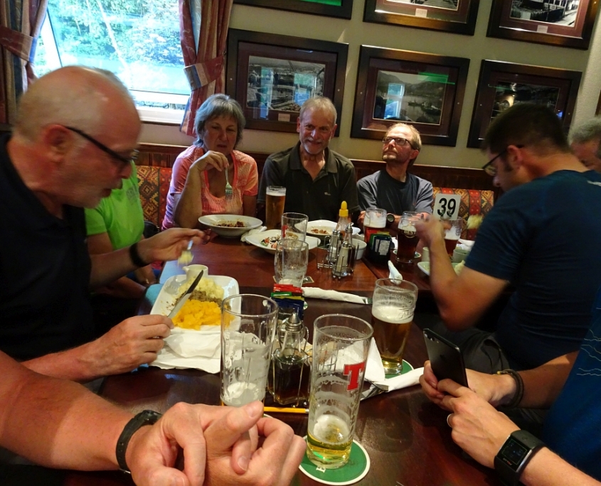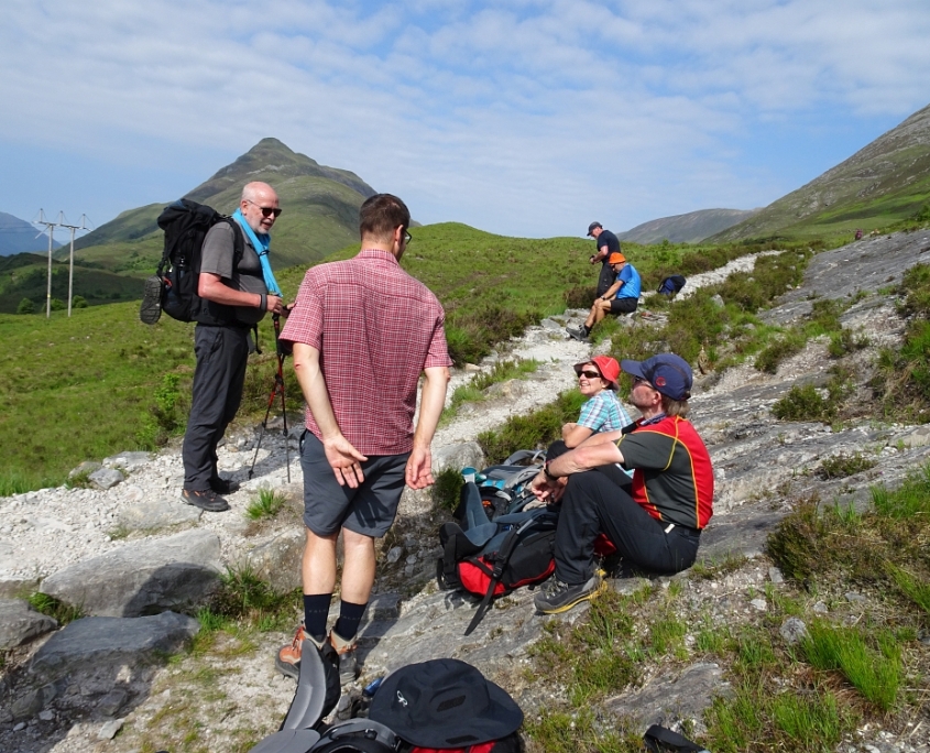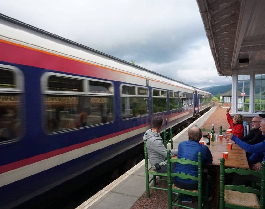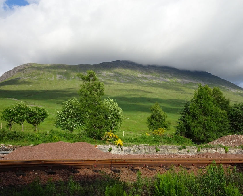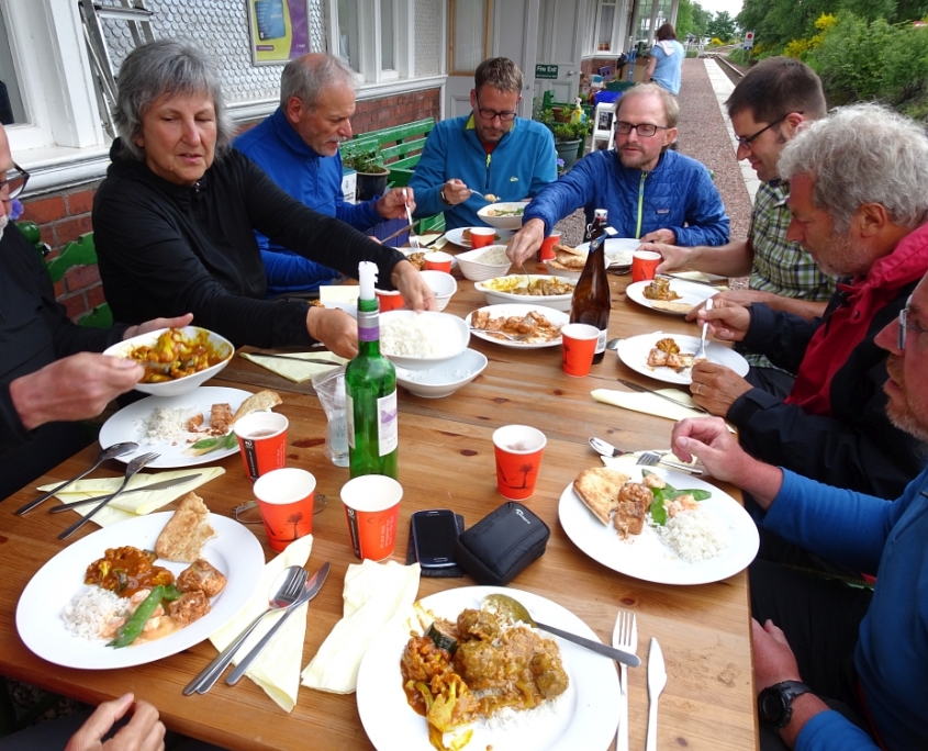 Heute ist eine Erholungsetappe angesagt. Ein gemütlicher breiter Weg führt uns größtenteils parallel zur Straße bzw. zur Bahnlinie verlaufend zu unserem Ziel dem West Highland Way Sleeper, einem ehemaligen Bahnhof, der zu einer Herberge umfunktioniert wurde. Während ein Teil der Gruppe den Nachmittag zum „Wunden lecken“ in der Herberge verbringt, lassen sich die Anderen nicht davon abhalten den 1074 m hohen „Beinn Dorain“ zu besteigen. Eine einfache aber anstrengende Bergwanderung, sind doch immerhin 900 hm zu bewältigen. Bei wunderschönem Wetter werden die Wanderer für ihre Mühen mit einer herrlichen Aussicht belohnt. Zum Abendessen erleben wir eine Überraschung, wie sie wohl noch auf keiner DAV-Tour vorgekommen ist. Die Unterkunft und insbesondere die Küche und der „Speisesaal“ machen eine „schmuddeligen“ Eindruck, was uns veranlasst uns zum Abendessen nach einer anderen Lokalität um zu sehen. Mangels Masse sind wir dann doch gezwungen im unserer Herberge zu essen. Kurzerhand stellen wir die Tische und Stühle nach draußen auf und funktionieren den Bahnsteig zum Restaurant um. Die Chefin des Hauses bekocht uns mit einem wirklich exzellenten indischen Diner, das wir so nie und nimmer erwartet hätten. Wir verbringen einen lustigen Abend, bei dem sämtliche Weinvorräte der Pension dran glauben müssen. (Typisch Pälzer halt!)