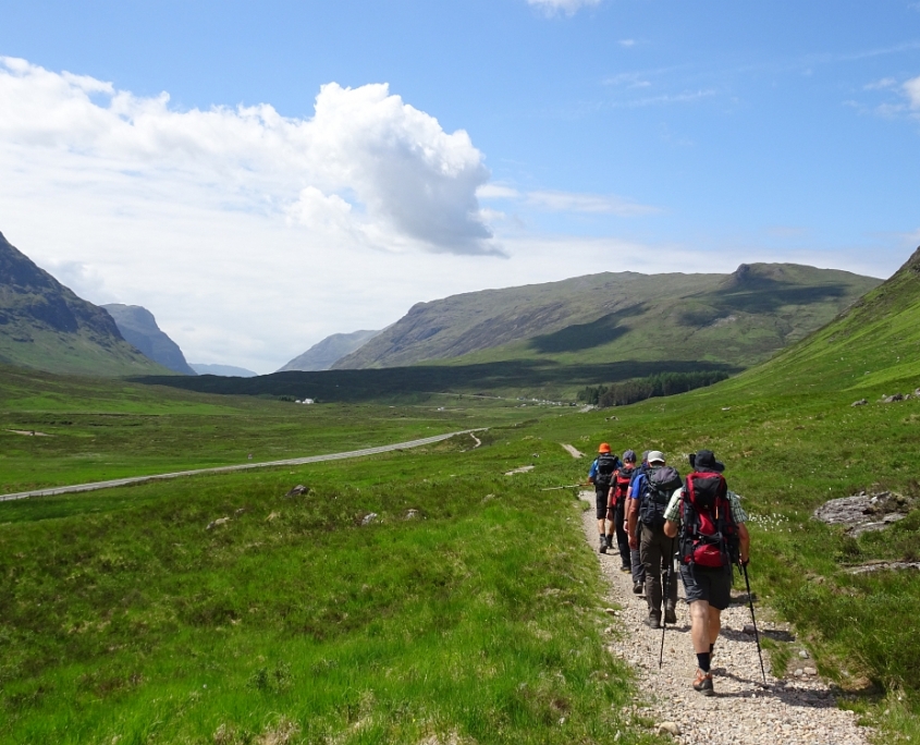Heute steht die Königsetappe auf dem Programm. Zunächst verläuft der Weg auf einer alten Militärstraße und führt uns auf den „Mam Carraigh“, obwohl nur 325 Meter hoch, bietet er einen der schönsten Ausblicke des WHW. Die nächsten gut 10 km verläuft die Etappe am Westrand von „Rannoch Moor“. Bei den guten Wetterbedingungen ist die Strecke kaum mehr als einfache Wanderung auf einem guten Weg. Bei Regen verwandelt er sich jedoch in den schwierigsten Abschnitt des WHW, was uns jedoch Gott sei Dank erspart blieb. Der Weg steigt nun stetig an, bis wir den Gedenkstein von Peter Flemming, dem Bruder des „James- Bond-Erfinders“ erreichen. Bergab durch das Tal „Glenn Coe“ erreichen wir das Clenn Coe Mountain Resort, eine Liftstation, die im Winter ein Ski-Gebiet erschließt. Einige Teilnehmer entschließen sich die letzten 12 km mit dem Taxi zurückzulegen, der Rest nimmt eine ca. 350 Meter hohe steile Rampe in Kauf um dann auf das fast auf Meereshöhe gelegene Kinlochleven abzusteigen. Eine sehr anstrengende Etappe, und so ist es kein Wunder, dass der erste Weg in die Gaststube des „Tailrace Inn“, unserer Unterkunft für die Nacht, führt.